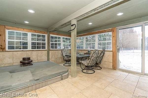 DON'T MAKE A MOVE WITHOUT seeing this private 2-acre cul-de-sac home in Leonard within Oxford Schools. Vaulted-ceiling living room features ceramic flooring and a striking two-way fireplace with raised hearths, black granite surround, and mantle. The open dining room with globe chandeliers flows via French doors into the spacious family room. The chef's kitchen offers white cabinetry, full pantry wall, stainless steel appliances that stay, double oven, island seating, herringbone backsplash, under-cabinet lighting, reverse osmosis at sink, ceramic tile, and a picture window overlooking the backyard. Family room includes a stepped ceiling, oversized windows, ceiling fan, and fieldstone fireplace, with French doors to a heated four-season room with ceramic tile, wall furnace, heated sunken hot tub, and glass block bar. The first floor also features a ceramic half bath with granite vanity, laundry room with utility sink, LG washer and dryer, granite folding counter, and storage. The first-floor primary suite offers vaulted ceilings, walk-in cedar closet, and en-suite with jetted tub, tiled shower, and granite vanity. Upstairs, a wrought iron spindled catwalk leads to three bedrooms--two with ceiling fans sharing a large ceramic bath with tiled tub/shower, oversized bedroom with three step-in closets! Additional highlights include crown molding, recessed lighting, ceramic tile and Lifeproof waterproof flooring, a full unfinished basement, two-car attached tiled garage, metal roof valleys, 6" gutters, and mature tree-lined acreage with fenced kennel area for furry or feathered friends.