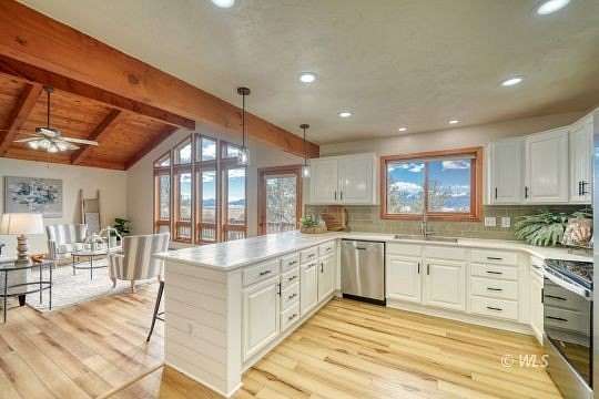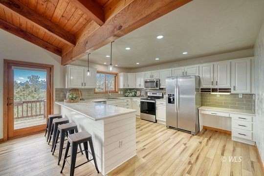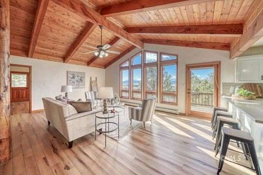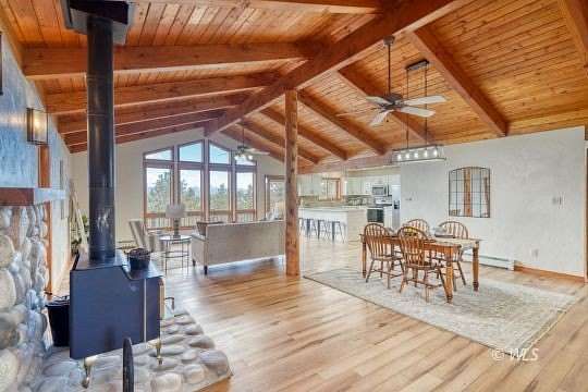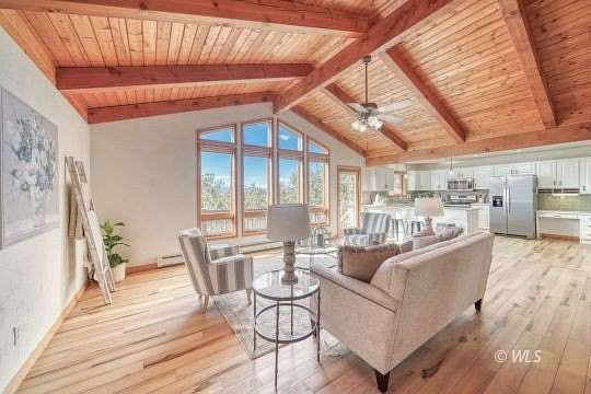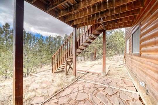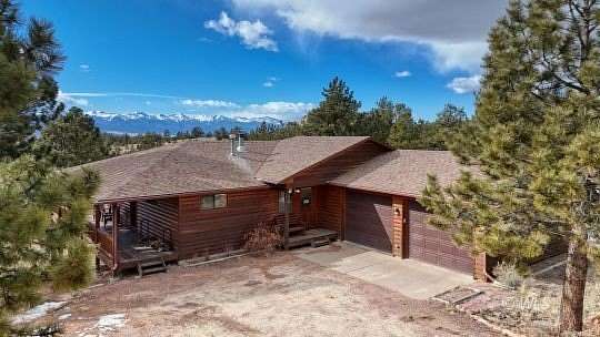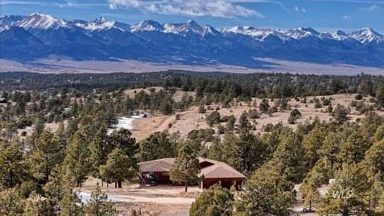 Experience true Colorado living in this stunning mountain retreat nestled among pines with breathtaking views of the Sangre de Cristo Mountains. Set on a treed parcel, this beautifully maintained home offers panoramic views from both inside and out. The spacious open-concept main level features soaring vaulted tongue-and-groove ceilings, exposed beams, expansive windows that frame the mountain views, and a cozy wood stove set against a striking stone hearth. The layout flows seamlessly from the living area to the dining space and into the updated kitchen, complete with white cabinetry, stainless steel appliances, solid surface countertops, tile backsplash, and a large center island with bar seating. Step outside onto the expansive deck to take in the fresh mountain air, abundant wildlife, and unforgettable sunsets. The home's warm wood exterior blends perfectly with the surrounding landscape, offering both privacy and natural beauty. Thoughtfully designed for comfort and functionality, this property provides generous living space, modern finishes, and a peaceful setting just minutes from town while feeling worlds away. If you've been dreaming of mountain views This is Your New Home