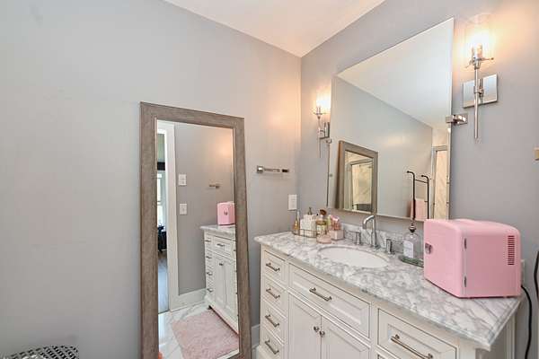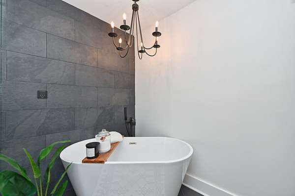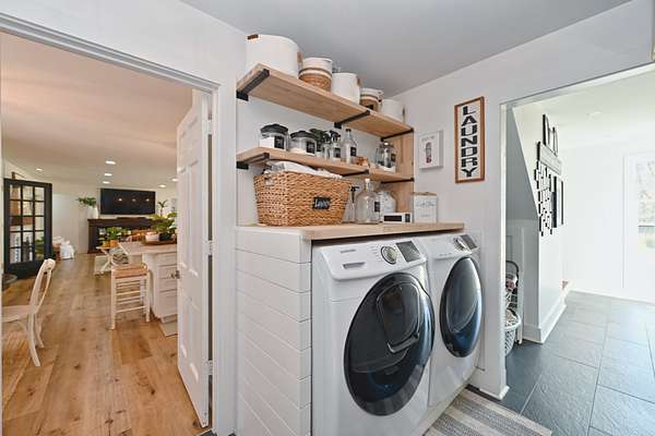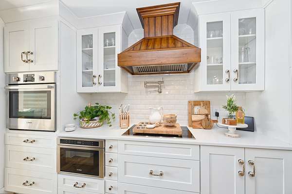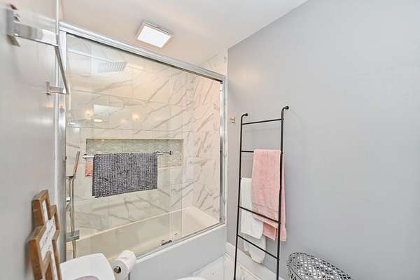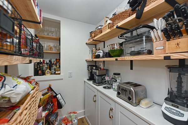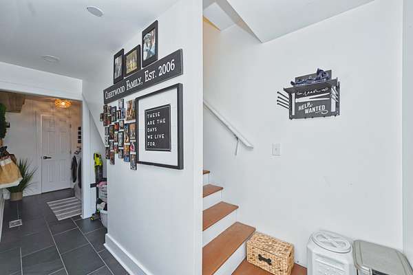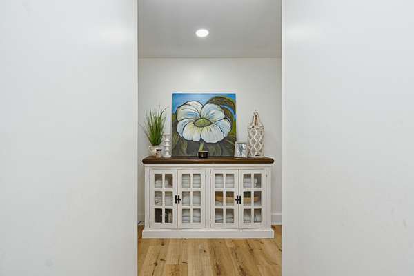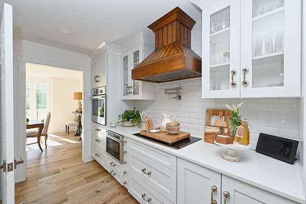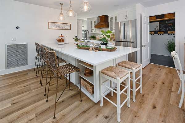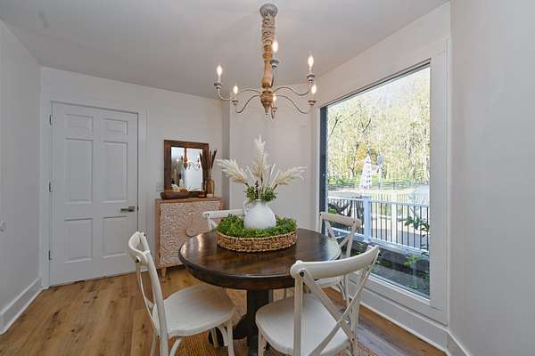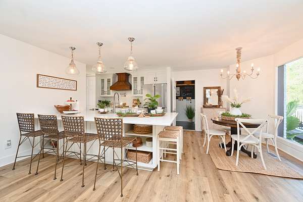 The kitchen has been fully updated with quartz countertops, custom soft-close cabinetry, and a full suite of high-end stainless steel Bosch appliances. Luxury vinyl plank flooring runs throughout for durability and low maintenance.