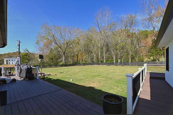 Outdoor living is just as impressive. A massive Trex deck provides low-maintenance entertaining space. The immediate backyard is fenced, and behind it sits nearly another flat acre of untouched land. The property backs to woods with no homes to be built behind you, offering long-term privacy.