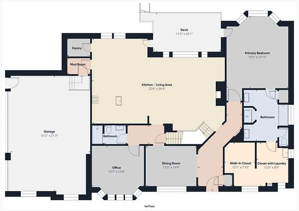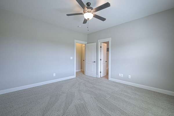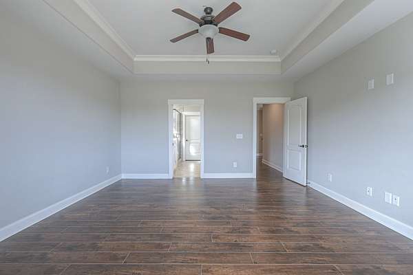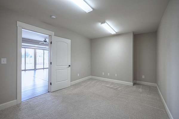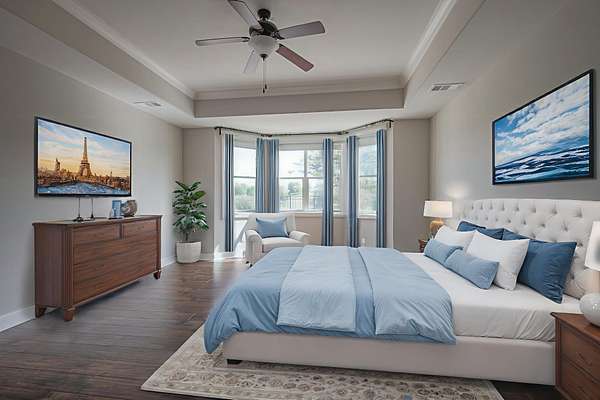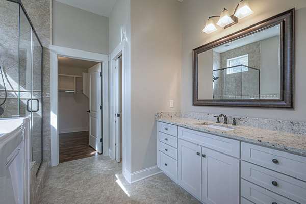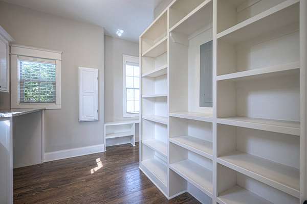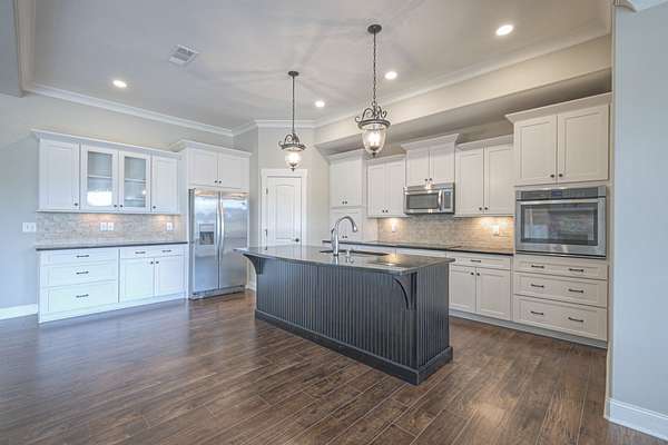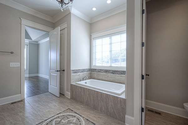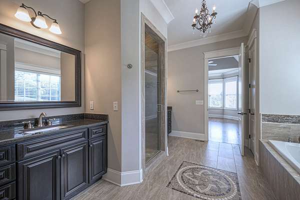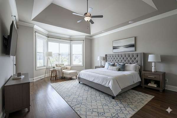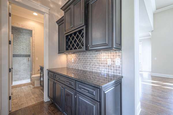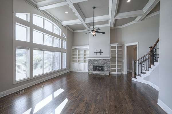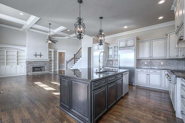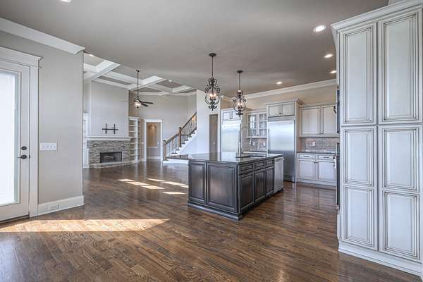Step into the main level, where soaring coffered ceilings and gleaming hardwood floors set the tone for refined living. The open-concept great room flows seamlessly into a chef's kitchen with high-end finishes, perfect for entertaining or quiet evenings at home. The primary suite on the main floor is a private retreat featuring a massive custom closet with its own laundry area and a spa-like bath. The functional home office with hardwood floors completes the main level.