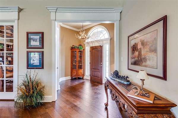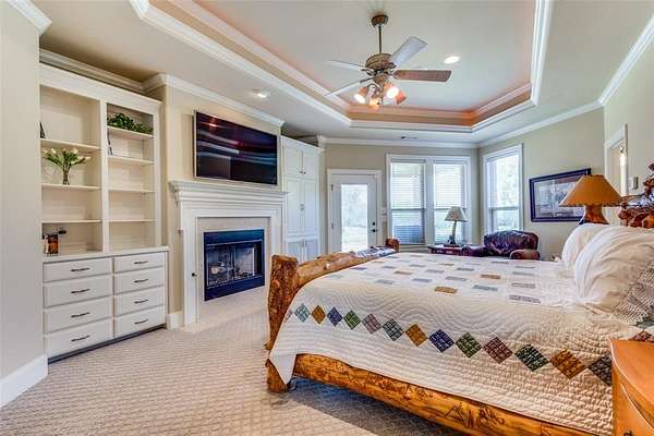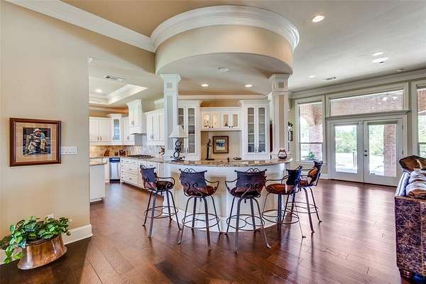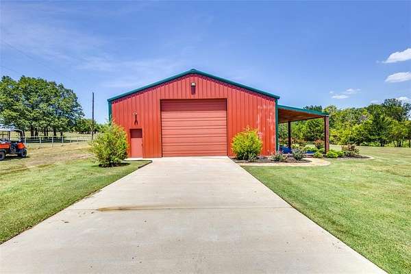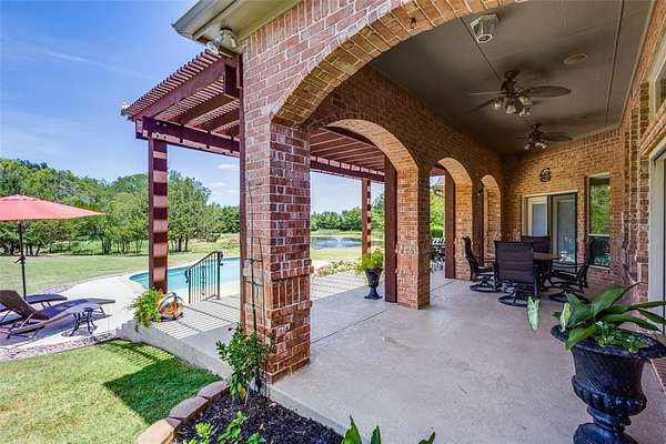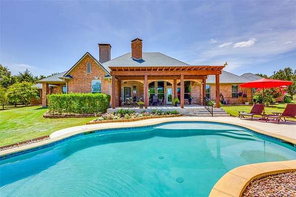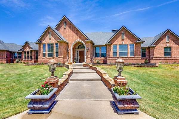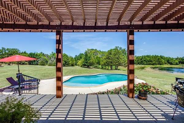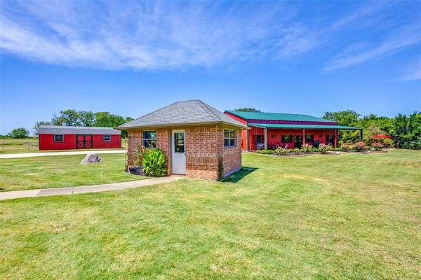 Don't miss out on this Stunning Custom Home with panoramic views of the Pool, Pond, and Fountain from the living room,Primary Suite, and Bath! Move-in ready with open layout, abundant natural light, and gourmet kitchen featuring granite countertops, Viking 6-burner gas cooktop, double oven, walk-in pantry, triple sinks, warming drawer, and more. Luxurious primary suite includes oversized walk-in custom closet. This Home features 3BR,3.5Bath home has mother in law suite and Surround sound and large-screen TV setup make it perfect for entertaining or relaxing. Property is in pristine condition with its beautiful finish out. It includes a water well with filtration, softener system, 3-car garage with natural light workshop, and 12’x30’ barn for storage or tools with electricity. Store your BOAT, RV, ATVs in the New 2,400 sq ft party barn with 16ft door (2023) with 3 beds, full kitchen, 1 full and 2 half baths all with HVAC and Large Front porch. Electric gated entry with brick-stone columns and seasonal landscaping. Perfect for a residence, lake house, and Airbnb! 6 Minutes from Lake Texoma and Marinas! Currently Working on getting Ag Exemption