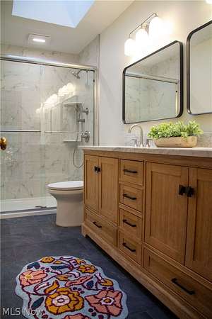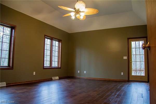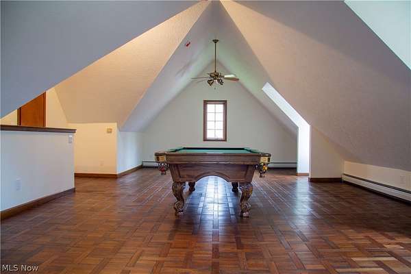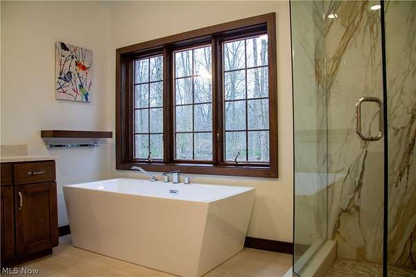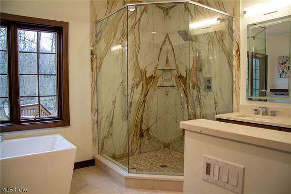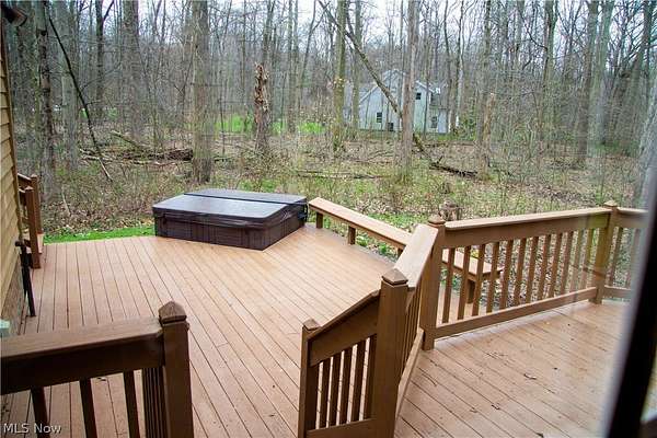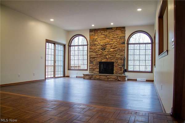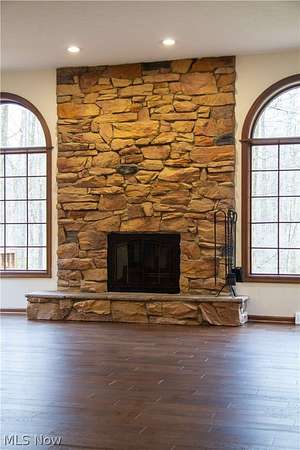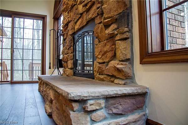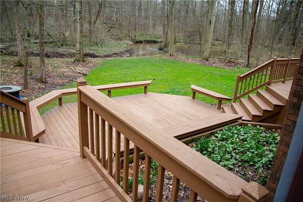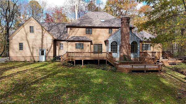 Timeless Craftsmanship Meets Modern Living on 13+ Acres in the Heart of the Western Reserve. Experience the beauty of Ohio's four seasons at this stunning one owner retreat. Overlooking the peaceful waters where Silver Creek meets the Chagrin River, this 5,885 SF cedar and stone colonial (5 bedrooms, 5 bathrooms) offers exceptional privacy, top rated schools, and close proximity to Metroparks, Geauga Park District, and Downtown Chagrin Falls. The Open floor plan features a spacious first floor primary suite with a newly renovated en suite bath and walkout to an 800+ SF wrap around, multi tiered deck with hot tub. Solid hardwood floors run throughout. The Great room showcases a dramatic stone fireplace and oversized windows framing serene water views. A warm, inviting office includes floor to ceiling built ins, new lighting, French doors, and parquet floors. Formal dining room with bay window, fresh paint and a Tiffany style chandelier creates an unforgettable setting for gatherings. The spacious eat in kitchen offers granite countertops, ample storage, appliances and deck access-perfect for cooking together as a family. Upstairs, four bedrooms feature brand new hardwood floors, generous closets, and access to two renovated full baths with solid wood vanities, quality fixtures, modern tile, and fresh paint. Massive bonus room (34' x 24') with vaulted ceilings, parquet flooring, ceiling fans and a pool table provides endless entertainment, plus a private entrance to the 3 car garage. The Otero Homes-designed finished basement (71' x 17'11") includes a fitness area, luxury bar, media space and a secret children's clubhouse with custom murals. Walk up access leads to the garage. First- floor laundry room includes a deep freezer and washer/dryer. New roof and exterior stain installed summer 2025. This secluded 13.1 acre gem offers endless opportunities to explore nature, breathe fresh country air while you enjoy quiet mornings on the deck.