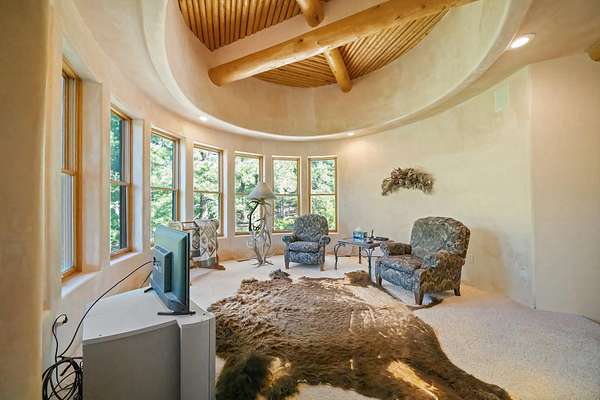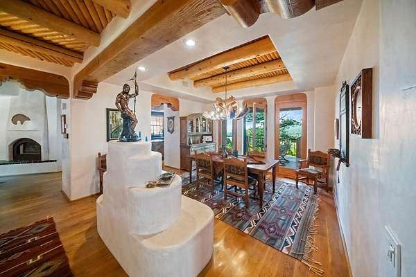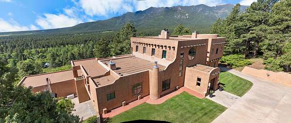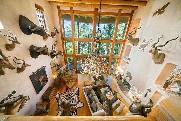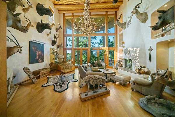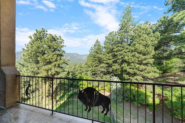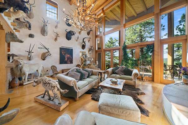 Handcrafted finishes include antler hardware, custom tile countertops by Summit Brick in Pueblo, copper-topped vigas, and custom doors built in Santa Fe. Light floods the home's interior through three stories of floor-to-ceiling windows in the great room, while six fireplaces, a full indoor/outdoor sound system, and a wood/gas boiler system enhance comfort year-round. The walk-out basement adds a full wet bar, entertainment area, and hot tub access beside a wood-burning fireplace.