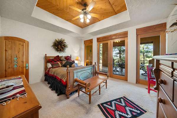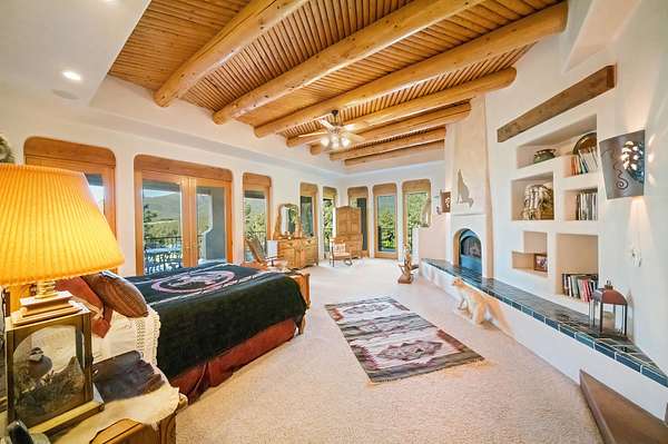 At the heart of the ranch is an 8,304+- square-foot custom Santa Fe-style residence offering five spacious bedrooms and six bathrooms. Meticulously designed, the home balances luxury with warmth--every room features generous closet space and direct access to patios or decks. The primary suite includes a steam shower, private balcony, gas fireplace, and a generous 11' x 15' walk-in closet.