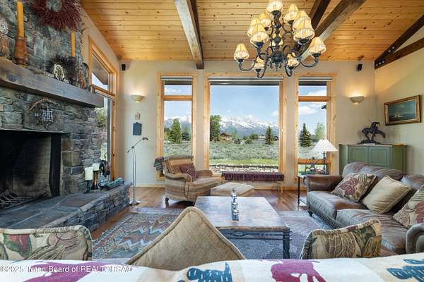 Set against the backdrop of the Teton Range, 8225 Spring Gulch Road spans 3.3 acres in Grand Teton Meadows, just North of the Town of Jackson and a short drive from Grand Teton National Park. With a spacious main residence, a detached two-bedroom guest house, and thoughtful separation between the living spaces, the home is perfectly suited for both hosting friends and family on vacation and year-round living. The main residence features four bedrooms and a dramatic living room with cathedral ceilings, a wood-burning fireplace, and oversized windows that draw your eye to the peaks beyond. Step outside to a stone terrace that wraps the home, the ideal space for summer dinners and slow afternoons spent taking in the scenery and Grand Teton views. The primary suite is located on the main floor and includes a sitting area, large bathroom, and views that greet you the moment you wake up. Downstairs, three additional bedrooms and a flexible lounge area allow guests to spread out in comfort and privacy. Set apart from the main residence, the guest house includes two bedrooms, a full kitchen, and a relaxed living area ideal for visiting family, friends, or caretakers. This property is horse friendly.