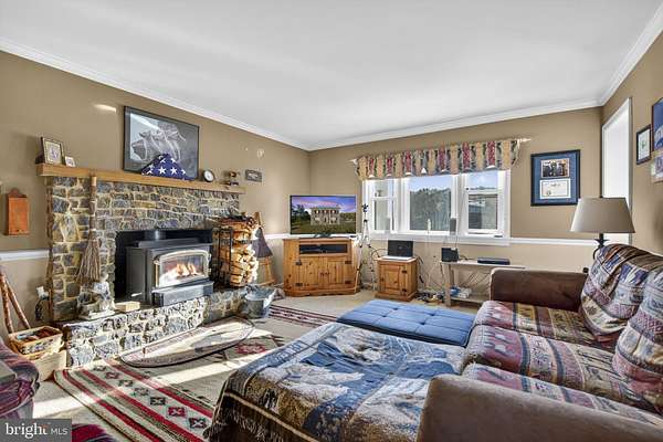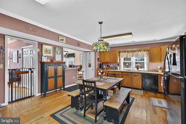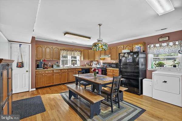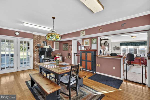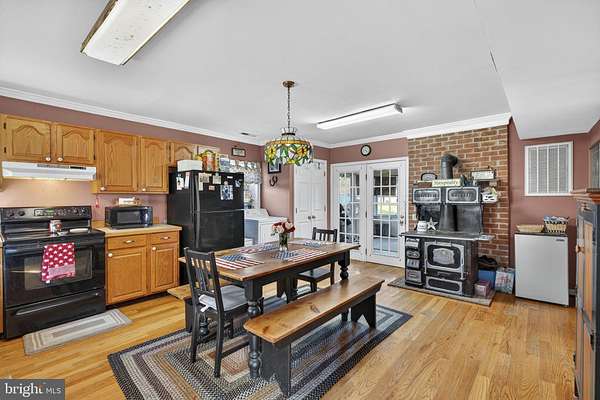 - Country Kitchen, Dining Area, Primary Bath(s), Table Space Kitchen, Window Treatments, Wood Floors, Wood Stove