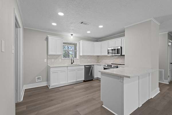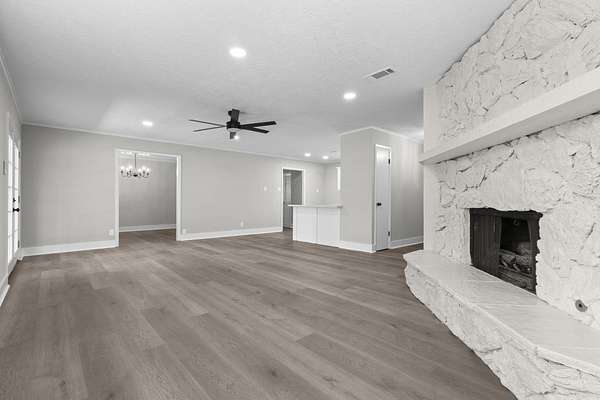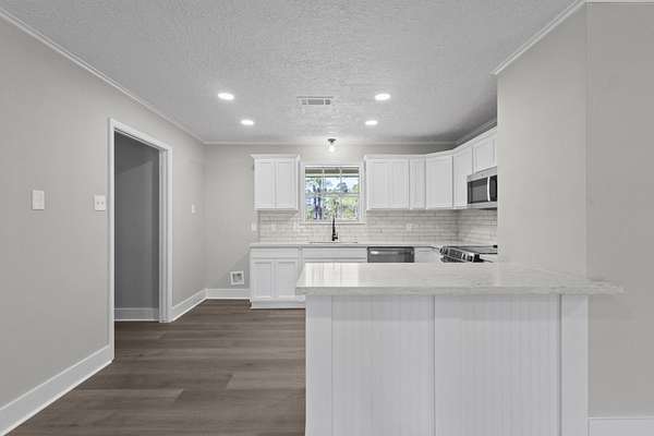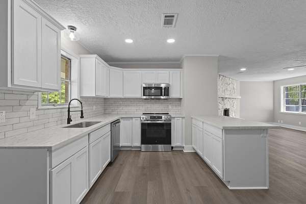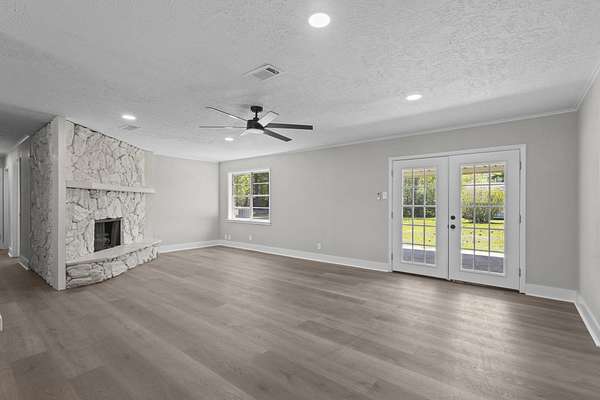 Charming 4BR, 2BA brick home in Silsbee, TX with inviting modern farmhouse style and a classic neutral color palette throughout. Light-filled kitchen features white quartz countertops, classic subway tile, white cabinetry, stainless appliances, and a breakfast bar. Dining room with custom built-ins flanking a picturesque window, provides an elegant space for entertaining. Comfortable living area with rock wood-burning fireplace and French doors opening to a covered patio. Spacious bedrooms and baths with gray tile and black accents. Situated on just under 1.5 acres with an ample sized storage building and indoor utility room. Welcoming sage green front door adds curb appeal. Feels like home from the moment you walk in! Schedule your private showing!