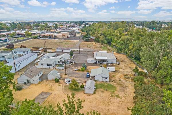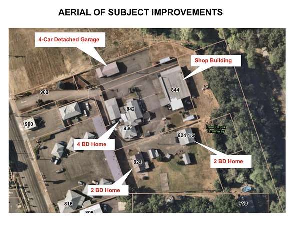 Zoned C-C (Community Commercial), this property offers a wide range of permitted uses, including multi-family residential development (MFR-30). The site is currently improved with a mixed-use facility consisting of the following structures: A 3,464 sq. ft. light industrial shop; 3 single-family residences; 2 single-car detached garages; One four-car detached garage; One attached four-car tandem garage. Improvements were constructed between 1948 and 1998 and are of wood-frame construction. Site enhancements include asphalt and concrete paving, perimeter fencing, and multiple storage sheds. The property spans six tax lots, comprising a total of 2.90 acres (126,324 sq. ft.). Of this, the net developable area is 1.98 acres (86,314 sq. ft.). Tax Parcels included are: 10703644, 10328558, 10328614,10328517, 10328541, 10328566. Site addresses: 824-902 N Riverside Ave., Medford.