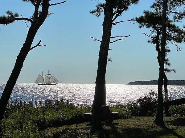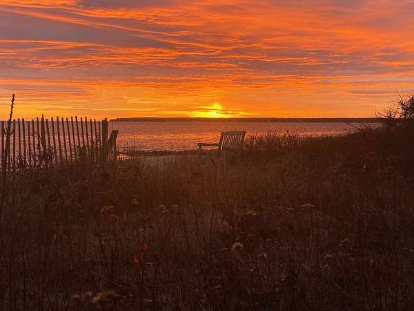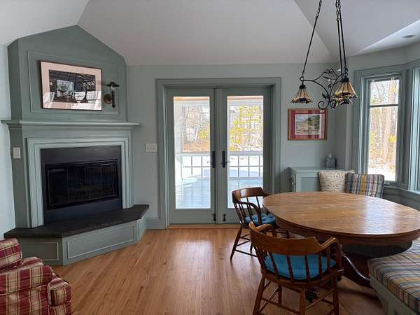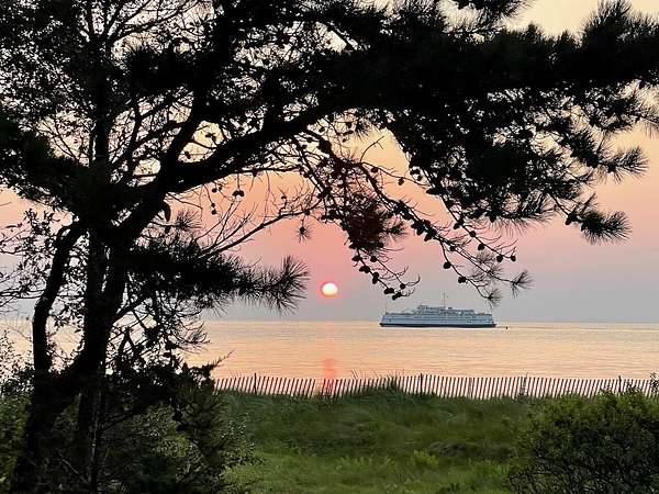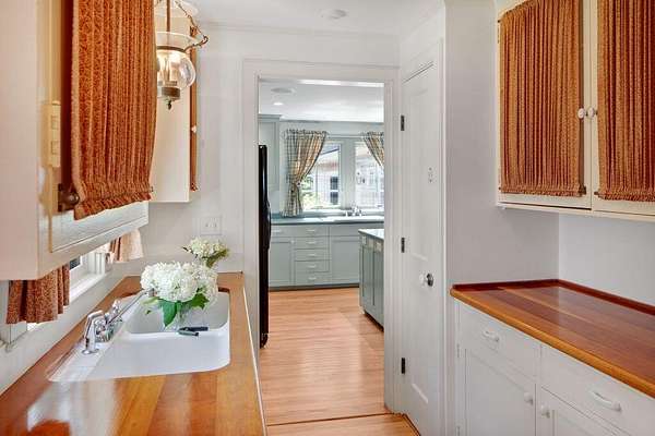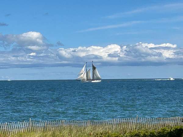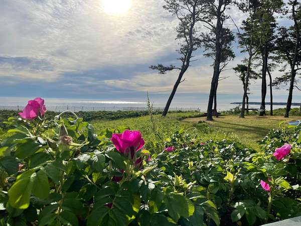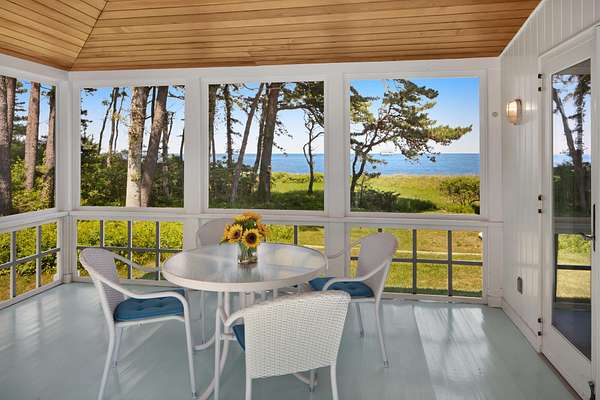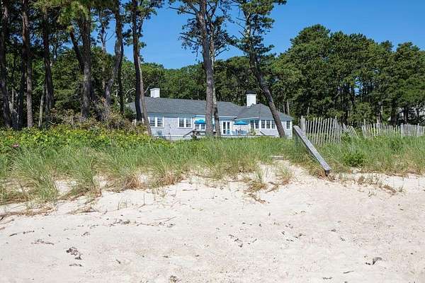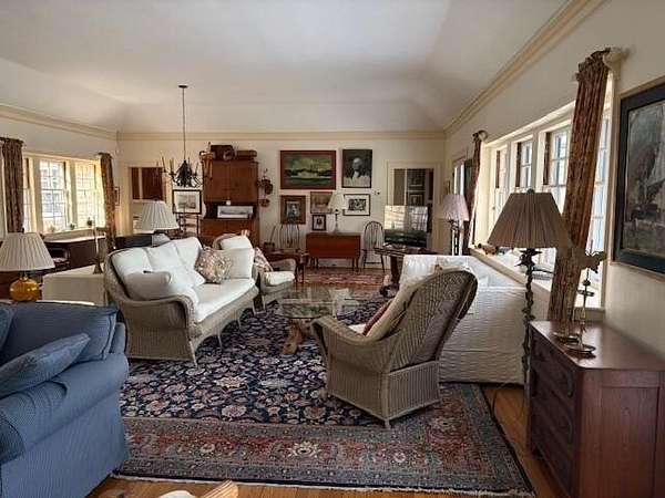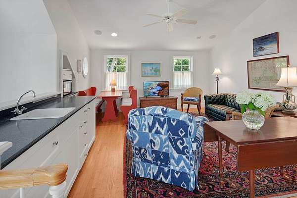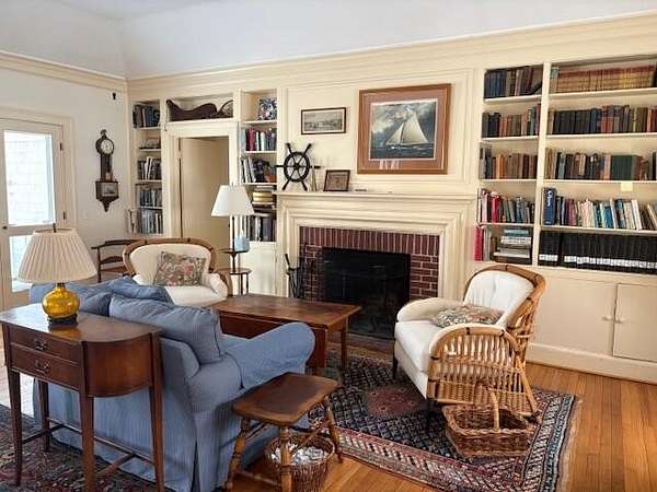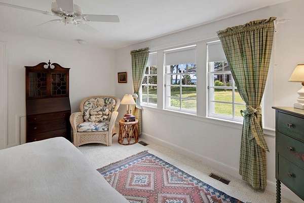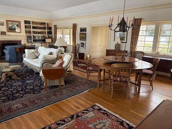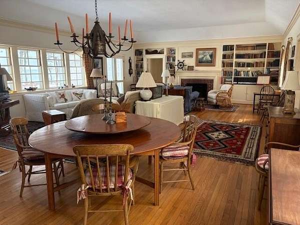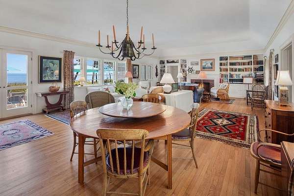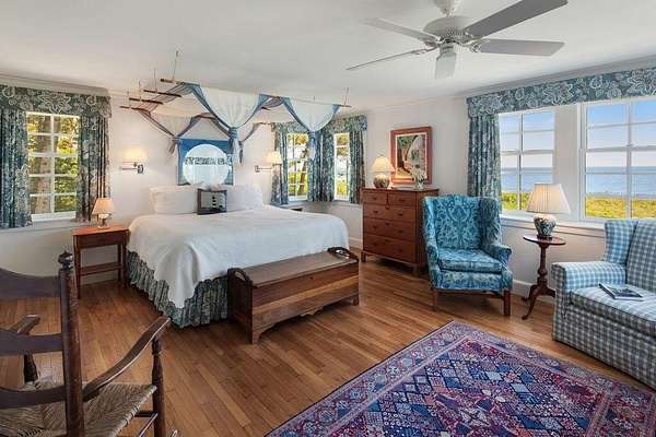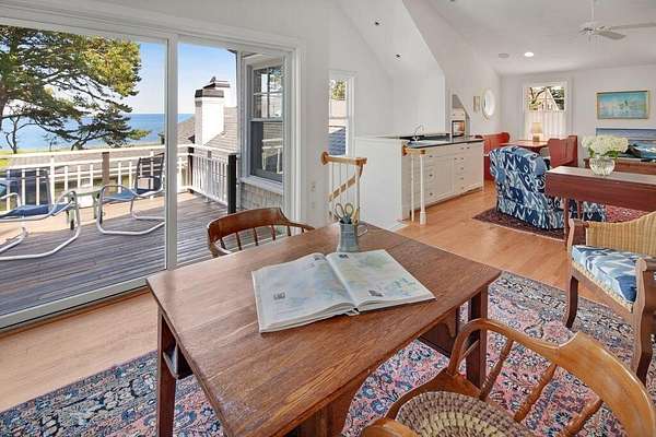 STUNNING WATERFRONT HOME IN WEST CHOP This elegant six-bedroom home with 200 feet of private sandy beach overlooks Vineyard Haven's outer harbor, the East Chop lighthouse and Nantucket Sound on 1.75 acres of land. Built in 1945, it was renovated in 2002 to include an attached three-car garage with a two-bedroom guest apartment above. A small entry hall leads to the great room with hardwood floors, the sweeping water views and French doors to the large deck. Built-in bookcases and a woodburning fireplace in the great room offer a gathering spot to chase the off-season chill. On the right are three bedrooms, one with ensuite bath. A shared bath and hallway with ample storage including a cedar closet complete the wing. To the left of the great room, the primary suite consists of a bedroom with sitting area and fireplace, luxurious bathroom with soaking tub and shower, and two walk-in closets. A butler's pantry opens to the kitchen. Expansive counter space and cabinetry including a center island make this a gathering spot. A breakfast room with a corner fireplace and built-in seating connects to a screen porch with a water view. Beyond are the garage and the second floor guest wing.
