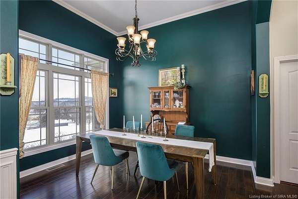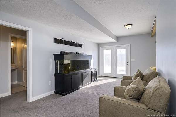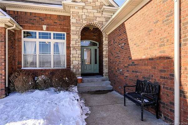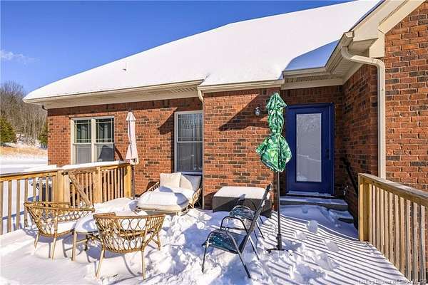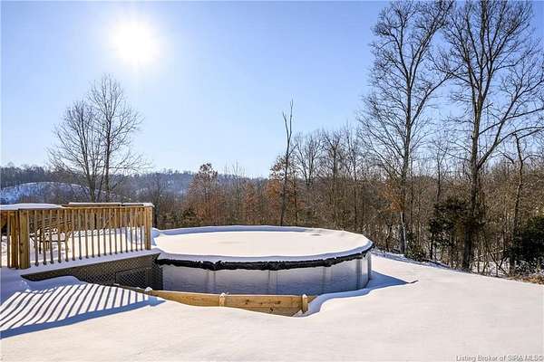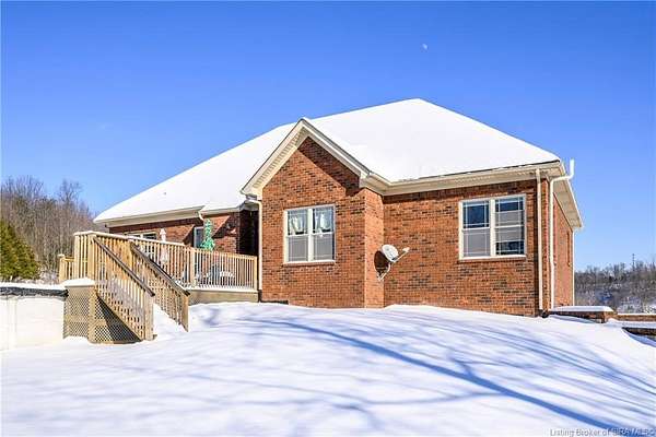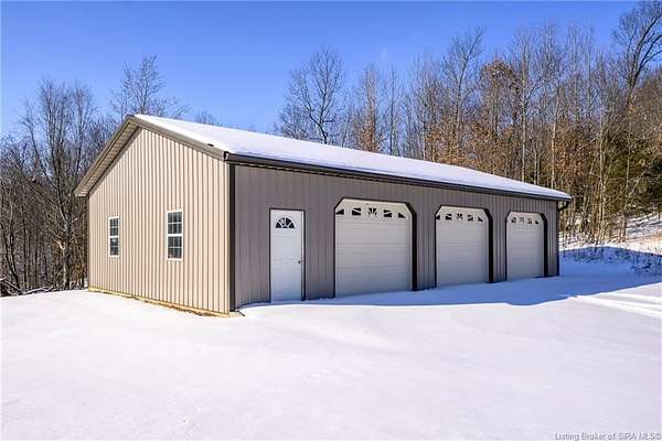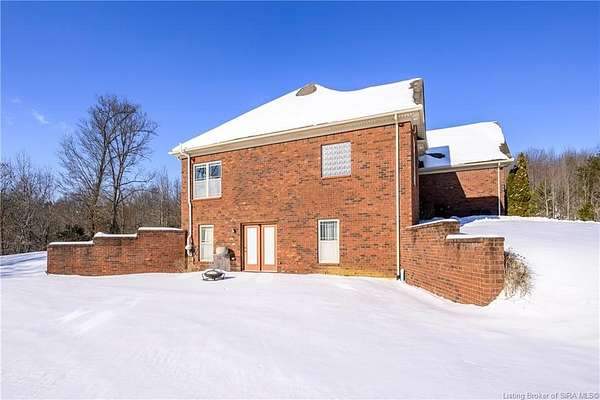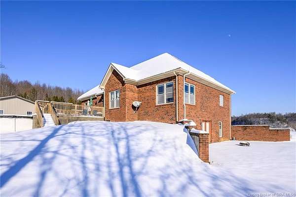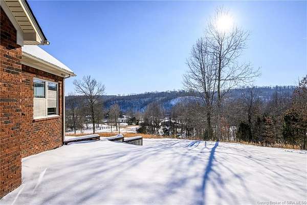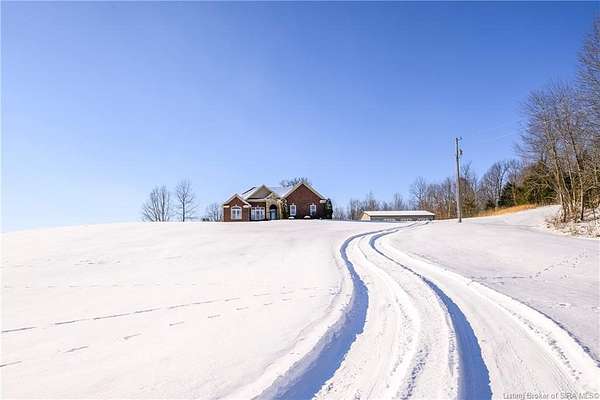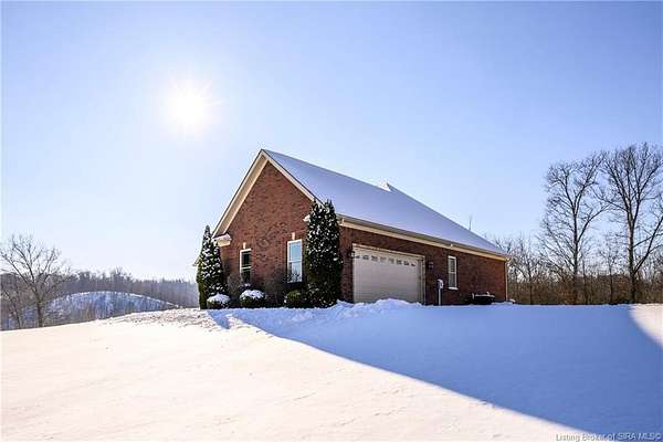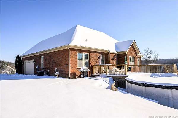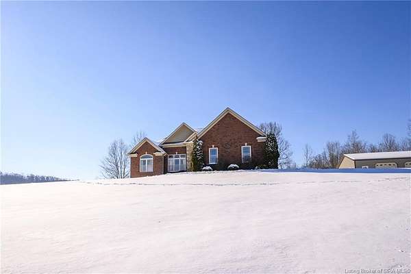 This gorgeous custom-built brick home sits on 3.26 acres and overlooks the scenic Borden Valley in beautiful Southern Indiana. This property features a 30x48 detached 3-bay garage, a full walk-out basement and has tons of extra features throughout like crown molding, arched entryways, and 10-12 foot ceilings. You will love the spacious primary bedroom with tray ceiling, an extra sitting area, walk-in closet, and beautiful en-suite bathroom, all conveniently located on the main level. The main level of this home also features an electric fireplace, a formal dining area, an amazing eat-in kitchen with pantry, first floor laundry room, 2 additional bedrooms and another full bathroom. When you step into the basement, you will find 10-foot ceilings, an additional bedroom, a full bathroom, extra storage, and plenty of extra space for your hobbies, games, and entertaining. The basement has also been plumbed for a wet-bar. All kitchen appliances remain including the washer and dryer, making this home truly move-in ready. The above-ground pool was installed by Backyard Staycations in 2023. Enjoy evenings on the back deck amidst an abundance of wildlife such as wild turkey and deer while admiring the quiet and peaceful views of the beautiful hillside and valley. Located only minutes to popular local coffee shop and diner, as well as minutes from the Monon Walking and Biking Trails and also conveniently located less than 20 minutes to Salem, New Albany and Sellersburg.