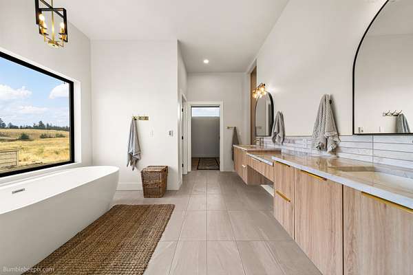 Discover this 2023 modern showpiece, where bold design meets natural elegance on 5 acres with sweeping Mt. Spokane views-just 10 minutes from downtown. A soaring 20-ft entry & striking staircase lead to a sunlit great room anchored by a towering fireplace and dramatic floor-to-ceiling windows. 16-ft retractable glass doors open to a covered patio with fireplace, creating an unforgettable experience. The gourmet kitchen impresses with an 11-ft quartzite island, Bosch coffee station, dual fridges, double dishwashers, & butler's pantry, all complemented by a massive dining space. The luxurious main floor suite offers heated floors, a spa shower, soaking tub & private patio access. The main level is complete with 2nd bedroom/office, a refined mudroom & expansive luxury laundry space. Upstairs features a spacious 9-ft ceiling loft with three additional bedrooms and full bathroom. With a 3-car garage, RV hookups, custom lighting, panoramic views, this home blends luxury, lifestyle, and functionality like no other.