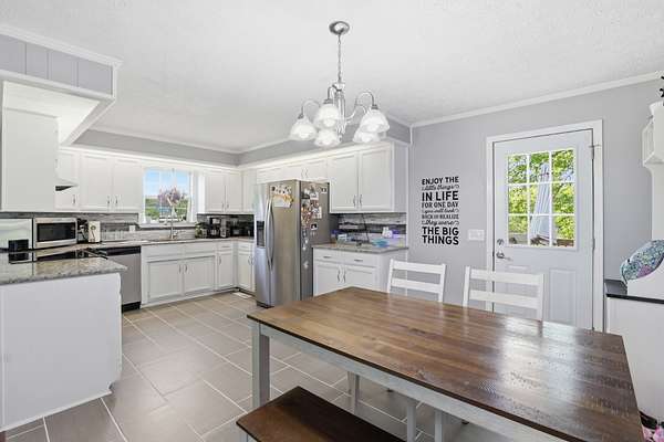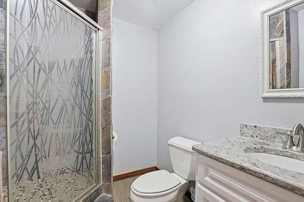 Inside, this well maintained home boasts an inviting eat-in kitchen with granite countertops, tile flooring, and stainless steel appliances, open to the living area. A full bathroom on the main level includes tile floors, granite vanity, and a combination shower and tub. The partially furnished basement offers a large recreation room and an additional full bath with shower, providing extra living space for guests or gatherings.