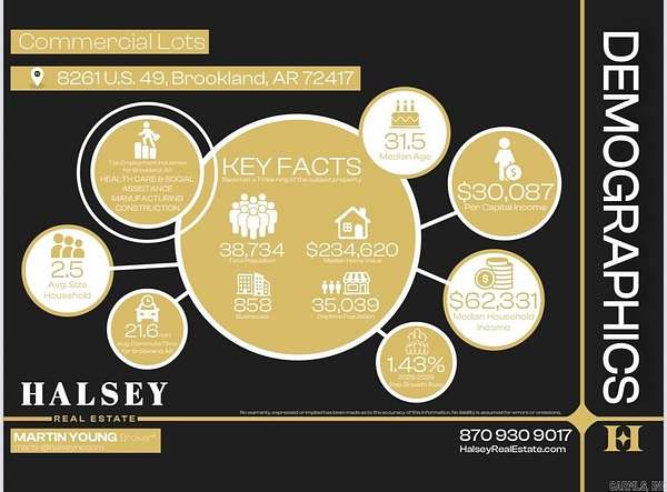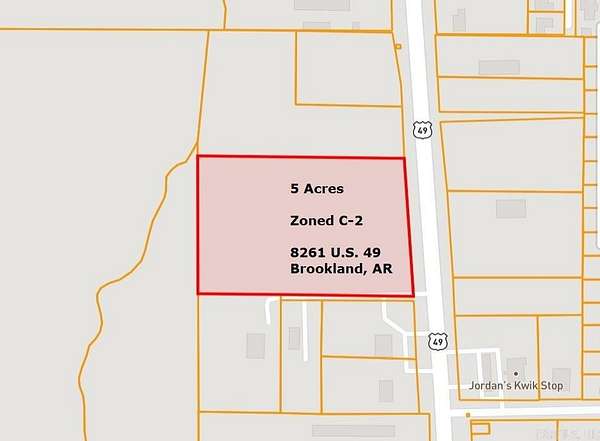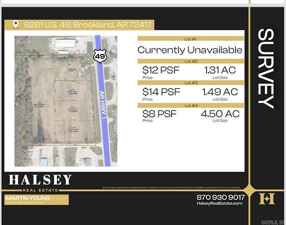 Beautiful commercial lots ranging in size from 1.3 to 4.5 acres. Road frontage on U. S. 49, located in the hottest developing are in Northeast Arkansas. This level property is Zoned Commercial and has all city utilities in place, including Sewer. Sporting substantial frontage on U.S. 49. Located near Harps Grocery, Brookland Schools, Citgo, Dollar Tree, NEA Baptist Clinic, as well as many other businesses. Make your plans to locate your business in the center of the Commercial District in Brookland, AR. Owner offering to provide Build To Suit for credit level retailers. Lot 2 is 1.3 acres priced at $12 psf. Lot 3, on the corner, is 1.49 acres priced at $14 psf. Lot 4, in the back is a 4.5 acre tract priced at $8 psf.