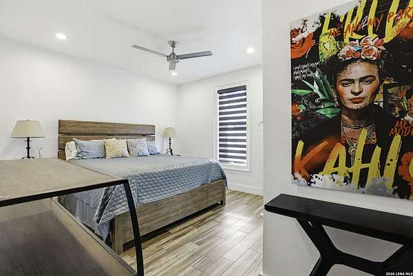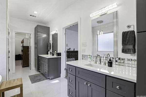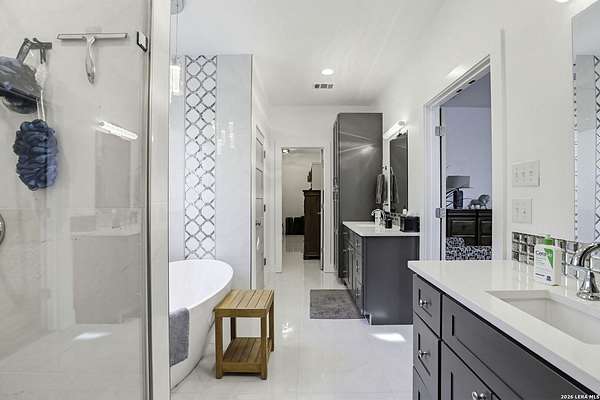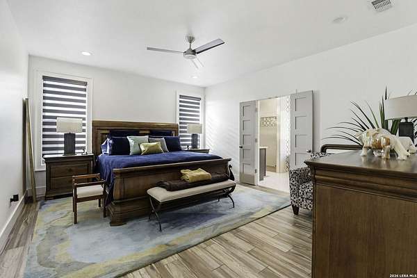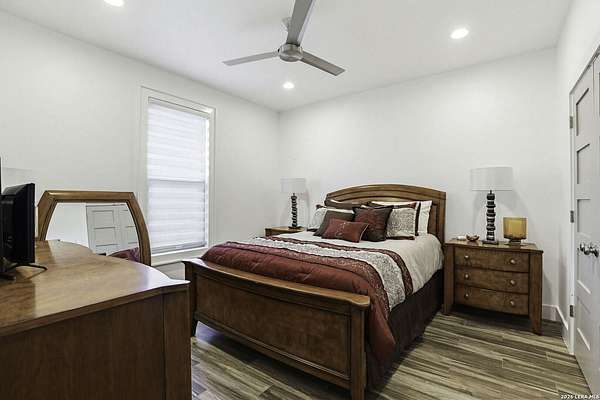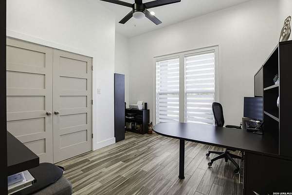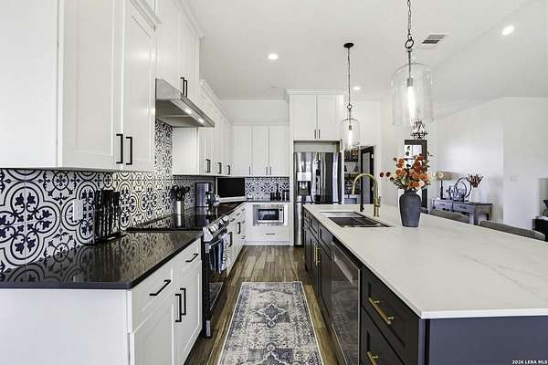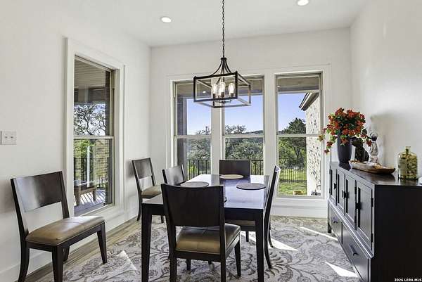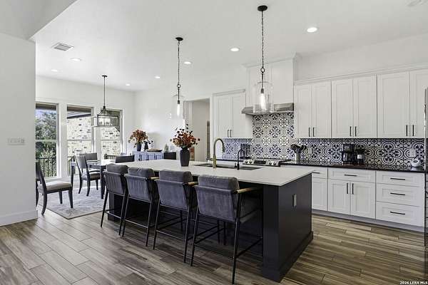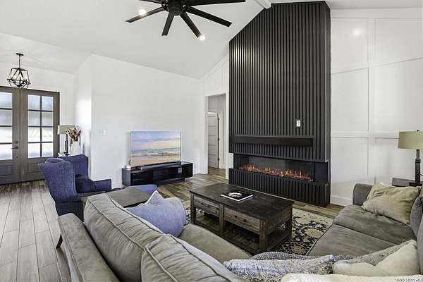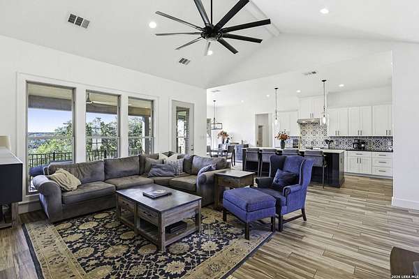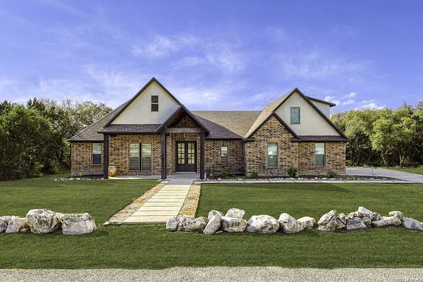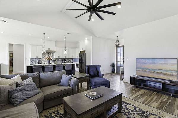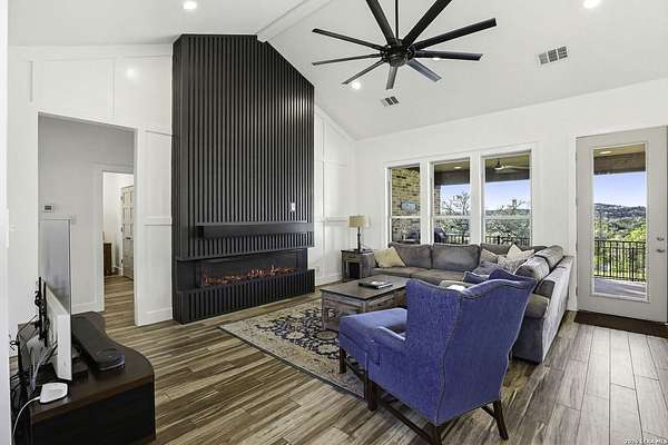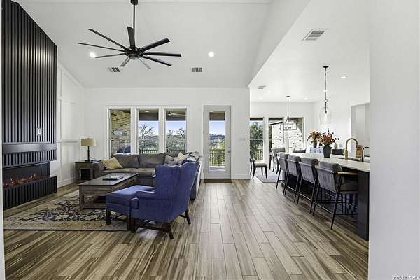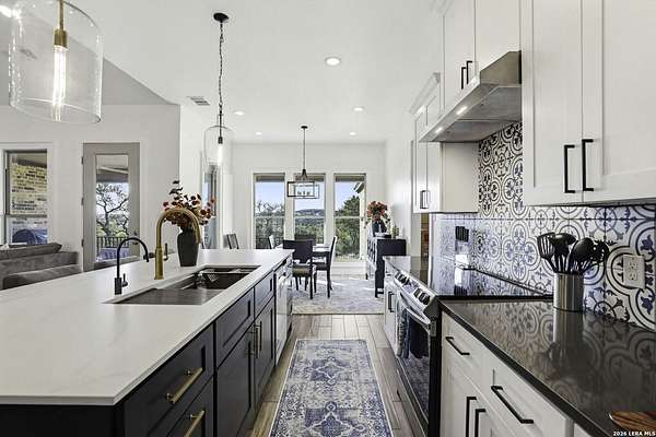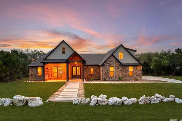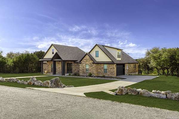 Open houses scheduled: 04/18/2026 from 12:30 PM to 3:30 PM 04/19/2026 from 12:30 PM to 3:30 PM Set on 2.5 acres in Laurel Canyon Ranch, this 2020-built 1.5-story home offers 2,901 sq ft, 5 bedrooms, 3.5 baths, and a flexible layout designed for modern Hill Country living. The open living area features soaring ceilings, long Hill Country views, and a custom media wall with linear fireplace. The kitchen opens to the dining and living spaces and includes an oversized island with seating for four, creating an easy flow for both everyday living and entertaining. A private guest suite adds flexibility for visitors, multigenerational living, or work-from-home needs. The spacious primary suite includes a striking bath and oversized closet. Outside, enjoy a covered patio, fenced yard, and beautiful sunset views. Community amenities include a catch-and-release fishing pond and trails extending through a 600-acre preserve, all just 3 miles from H-E-B and close to everyday conveniences.