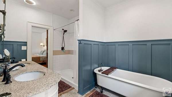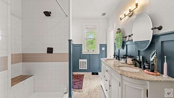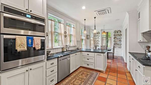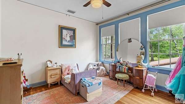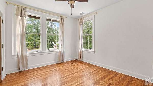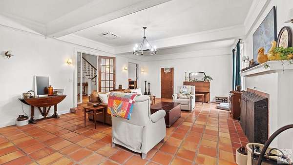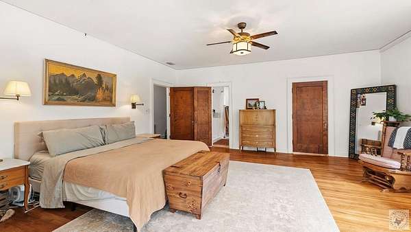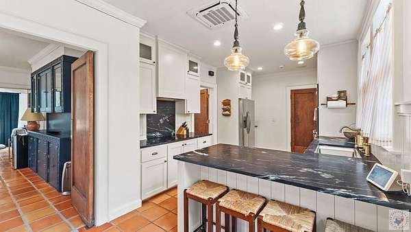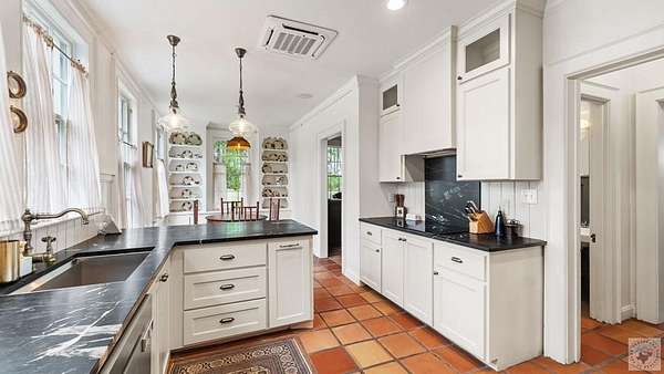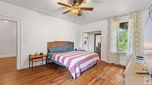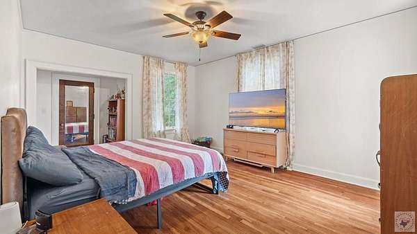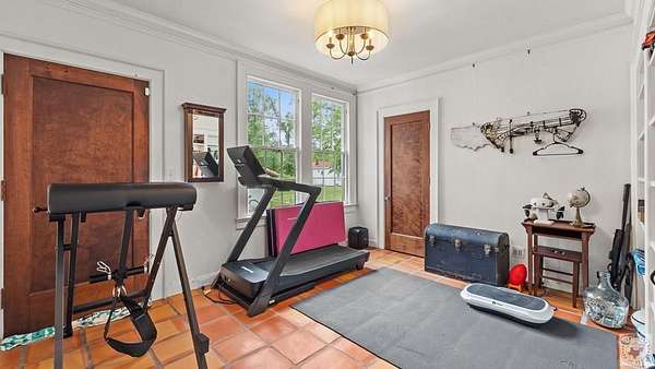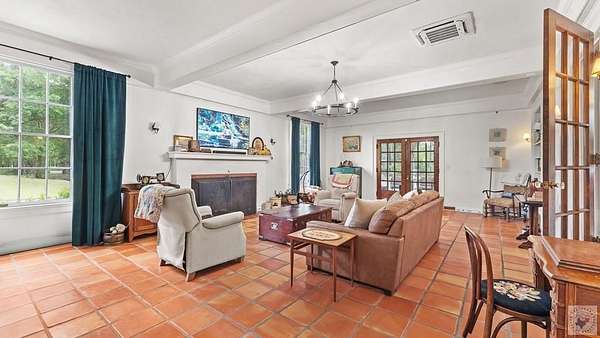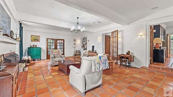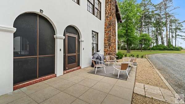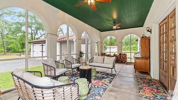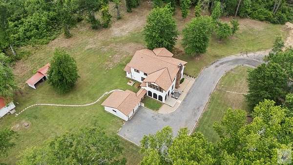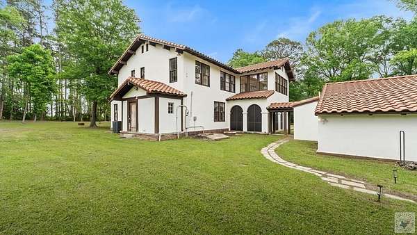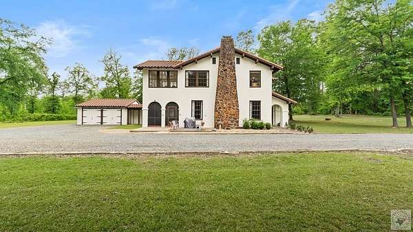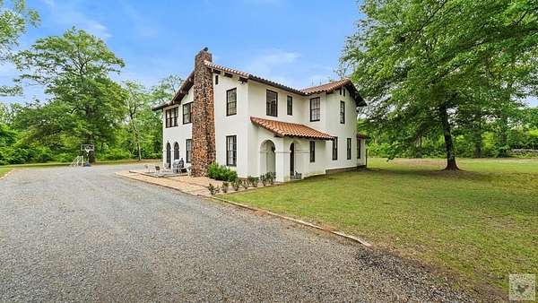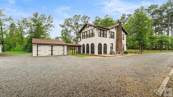 Set on four acres in Texarkana, this Mediterranean-style home carries a presence you don't see often. From the barrel tile roof to the original exterior lighting, the character starts before you ever step inside. This home offers five bedrooms and two and a half baths, with Spanish tile floors running throughout the main living areas. Original doors and large windows bring in natural light while preserving the integrity and charm of the home. A wood-burning fireplace anchors the living space and adds to the warmth you feel as soon as you walk in. The layout gives you room to live comfortably, with a balance of open areas and more private spaces. Downstairs is equipped with mini splits for efficient, flexible comfort, while the upstairs is serviced by central HVAC. The primary bedroom connects directly to a sunroom. It's a quiet, light-filled space that works perfectly for slow mornings or an upstairs office. One of the standout spaces is a flex space or fifth bedroom, currently set up as a small home gym. It was previously a record room with built-in shelving and audio wiring already in place. It's a space with personality that could easily remain an exercise space, or converted back to a music room or library. The laundry room is oversized and thoughtfully designed, complete with a dog wash station. Outside, you'll find a detached garage that works just as well for parking as it does for a workshop or hobby space. The screened-in patio offers a comfortable place to start or end your day, overlooking the surrounding acreage. Tucked away on the property is a one bed, one bath guest house currently operating as a successful Airbnb. It's well done, inviting, and offers immediate income potential, or could serve as a private space for guests or extended family. This is a home with history, character, and flexibility. It's been well cared for and still holds onto the details that make it so unique.