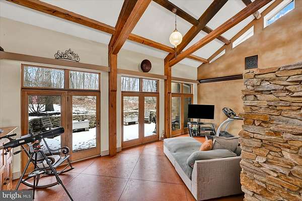 Nestled on 25+ picturesque acres in a private rural setting rich with abundant wildlife and breathtaking scenic views, this remarkable Horse Sanctuary blends thoughtfully designed equestrian amenities with a rare Frank Lloyd Wright inspired, ranch-style residence. Crafted with passive solar principles, featuring concrete floors, extended roof overhangs, and south-facing windows. The land and facilities are purpose-built for horses, offering space, functionality, and serenity in a setting designed for harmony with nature. At the heart of the sanctuary is a sizeable 60' x 100' pole barn featuring a welcoming double door entry opening to an indoor riding arena, with premium fiber-and-sand footing blended with magnesium chloride (MAG), creating a high-performance, dust-free, and stable surface with no need for watering. A rear access door leads directly to an outdoor riding arena, allowing for seamless year-round training and riding. A second 32' x 80' pole barn offers 11 stalls (including two doubles), along with a feed room, wash stall, tack room, storage, and a dedicated 10' x 10' office, making daily operations efficient and comfortable. The sanctuary also includes four fenced riding paddocks, with run-in sheds, automatic waterers, and some with integrated storage rooms. A charming, in-use vintage outhouse adds a smile-worthy touch of old-fashioned farm life for those working or visiting the farm. There are also storage sheds and a 21' x 22' detached garage providing functional space for equipment, vehicles, or hay storage. Completing the outdoor amenities is an inviting cabin perfect for visitors or caretakers. It features a generous covered front porch; a cozy living area with a woodstove and mini-split, for year round comfort; a full bath with a walk-in shower and closet; and a charming loft sleeping area. A riding trail winds through the woods. The architecturally significant home anchors the property with a seamless connection to its surroundings. The expansive great room showcases vaulted, wood-beamed ceilings, dramatic walls of glass, and a stunning floor-to-ceiling stone Russian Stove serving as the focal point. Dining and living space flow into a recently updated (2025) kitchen offering an island, pantry, and stainless steel appliances, with a first-floor laundry room and powder room conveniently located nearby. A private wing of the home offers two spacious bedrooms, a cozy reading nook or remote work space, and an updated (2023) full bath highlighted by a striking freestanding copper soaking tub. Ample storage is found throughout the home. A finished walk-out lower level adds flexibility with an additional full bath, third bedroom or bonus room, and a game room with a wet bar and access to a side patio. The attached 20' x 23' garage is currently used as an in-home gym, offering a wellness-focused space inspired by professional training needs. It could be converted to other living space or back to a traditional garage. Whether imagined as a working Horse Sanctuary, training facility, or serene equestrian retreat, this exceptional property is a rare haven where humans and horses alike feel comfort, love, and connection. Every part of the land holds intention and beauty, offering privacy, purpose, and timeless design-an unparalleled opportunity for those seeking something truly special. Set in a rural country setting, it's just a short drive to Spring Valley Park, PA where you will find a multitude of riding trails. You are also a short commute to Delta, Fawn Grove, the Mason/Dixon Line, Whiteford, Pylesville, Jarrettsville, and even Hunt Valley, MD. Nature enthusiasts will delight in nearby escapes including Susquehanna State Park, Muddy Run Park, Holtwood Dam, Kilgore Falls and Rocks State Park. The property is enrolled in Clean and Green. AGENTS - Please read Agent Remarks before scheduling a showing.