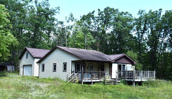 Beautiful property with so many extras. House, chicken coops, 50x56 pole barn (interior enclosed 32x24), greenhouse, garden area, fruit trees, Seclusion is what you will find with this 3bedroom 1-1/2 bath home on 10 acres of hardwoods bordering 1,000s of acres of state land. Near snowmobile and ATV trails. Large finished and heated bonus room above garage could be converted into additional living space. Newer windows, tiled floors and kitchen. A must see!