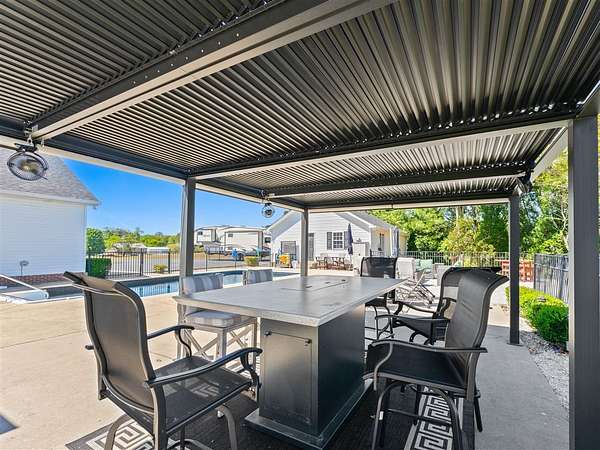 - Backyard Fence, Concrete Walks, Covered Front Porch, Covered Patio, Exterior Lights, Fence, Fenced Pool Area, Garden Area, Outdoor Lighting, Swimming Pool-In Ground