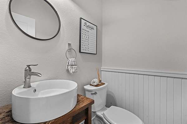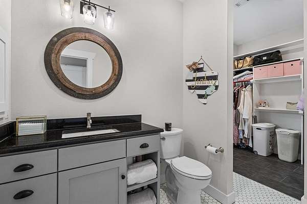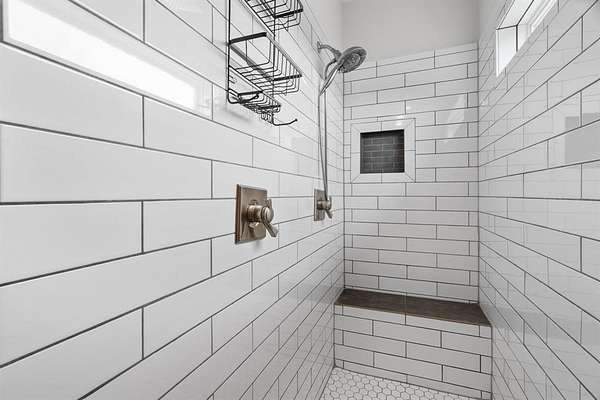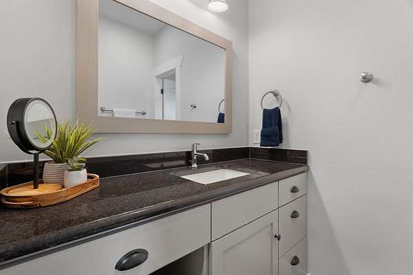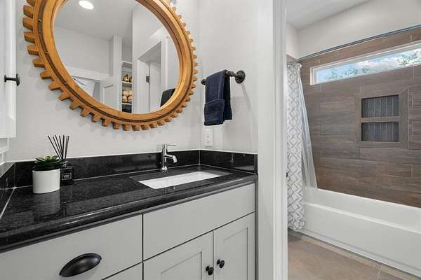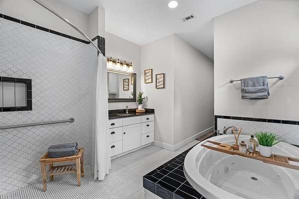 The kitchen pairs beauty and function with a farmhouse sink, Sub-Zero refrigerator, luxury gas range, and seamless flow into the dining and outdoor areas. A private study with barn door sits just off the main living space. The downstairs primary suite offers a true retreat with a sitting area and spa-like bath featuring a jetted tub and walk-in shower.