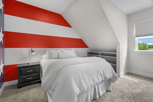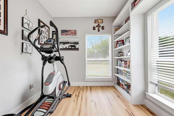 From the moment you arrive, the front porch and surrounding trees set a peaceful, welcoming tone. Inside, the main home opens to a bright, airy layout centered around a standout living room with a floor-to-ceiling bookshelf, rolling ladder, large picture window, and cozy reading nook. An electric fireplace adds warmth and ambiance year-round.