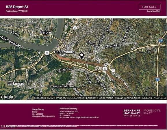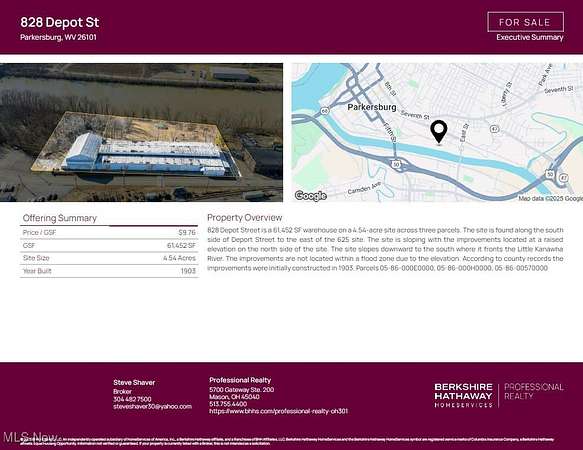 Est $3,654/mo828 Depot Street is a 61,452 SF warehouse on a 4.54-acre site across three parcels. The site is found along the south side of Deport Street to the east of the 625 site. The site is sloping with the improvements located at a raised elevation on the north side of the site. The site slopes downward to the south where it fronts the Little Kanawha River. The improvements are not located within a flood zone due to the elevation. According to county records the improvements were initially constructed in 1903. Parcels 05-86-000E0000, 05-86-000H0000, 05-86-00570000