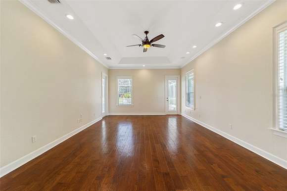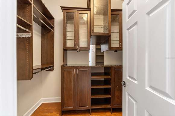 - Built-In Features, Crown Molding, Eat-In Kitchen, Open Floorplan, Primary Bedroom Main Floor, Solid Wood Cabinets, Stone Counters, Walk-In Closet(s)