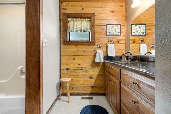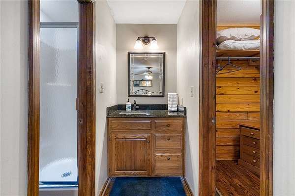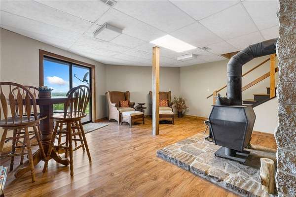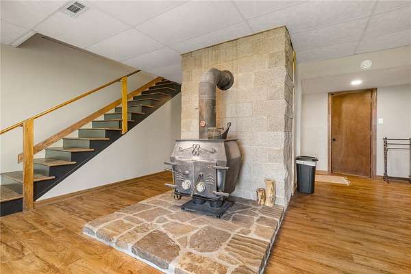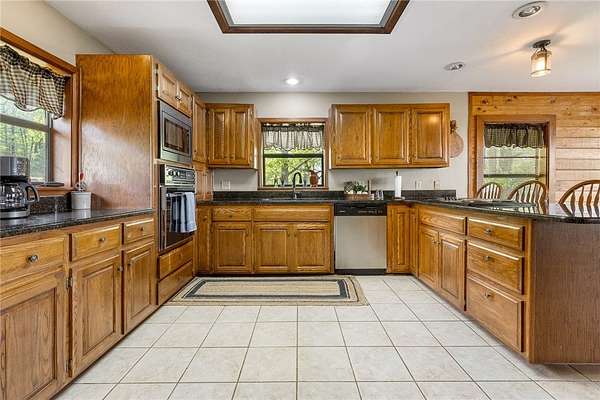 - Cathedral Ceilings, Ceiling Fans, Eat In Kitchen, Multiple Living Areas, Pantry, Programmable Thermostat, Split Bedrooms, Tile Counters, Tile Countertop, Walk In Closets, Window Treatments, Wood Burning Stove