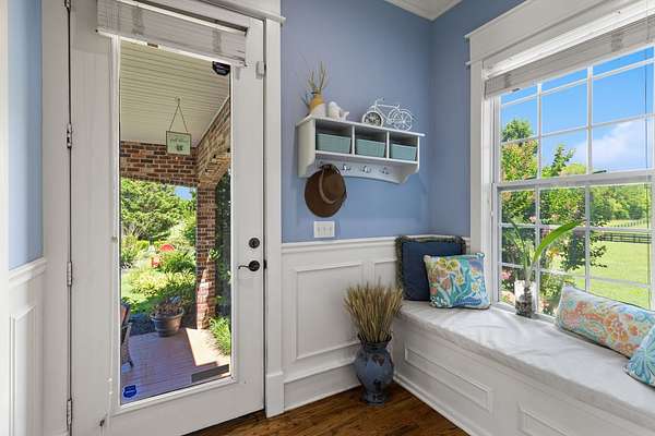 Outdoors, a covered patio invites you to relax and unwind while overlooking an enchanting English garden blooming with rose bushes, gladiolus, peonies, and more. There's ample space for both flower and vegetable gardening, as well as the potential for a future pool bath addition.