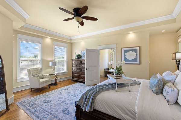 Step inside to soaring 10-foot ceilings on the main level, creating a spacious and airy feel throughout. The lavish primary suite features an en-suite bath, a generous walk-in closet, and its own washer/dryer for ultimate convenience. The gourmet kitchen is a chef's dream, showcasing custom cabinetry, soft-close drawers, a large island, and a built-in cooktop--perfect for hosting and everyday living.