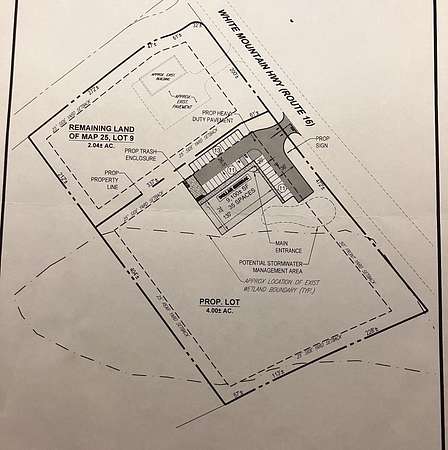 Commercial land offering consisting of approximately four acres with strong visibility and frontage along Route 16 in Ossipee New Hampshire. Located on a well traveled corridor serving the Lakes Region this site offers excellent exposure convenient access and long term commercial potential for a variety of permitted uses. The land features a favorable layout with a mix of usable open area and natural surroundings allowing flexibility for future site planning. The property is not served by municipal water or sewer and wetlands are present on the parent parcel. Buyers should plan for private systems and conduct their own due diligence regarding development feasibility permitting and intended use. Seller intends to convey approximately four acres from the existing six acre parent parcel. Sale is subject to subdivision approval and recording and the subdivision process is currently underway. Final acreage boundary lines access and any required easements will be determined by the approved subdivision plan. Approximate acreage only with final acreage to be confirmed upon approval. Subdivision and future development may require local and state level approvals depending on proposed use and final layout. Buyers should anticipate that subdivision approval and recording is a multi step process and timing will vary. Closing cannot occur until the subdivision is fully approved and recorded. As an added benefit the purchaser of this parcel will receive a right of first refusal should the seller ever decide to sell the remaining parent lot. Parent parcel deed recorded at Carroll County Registry of Deeds Book 3053 Page 0641. Draft subdivision sketch available for reference only. All details subject to final approval.