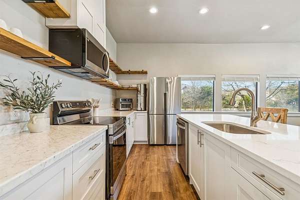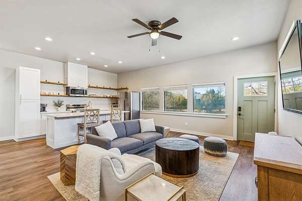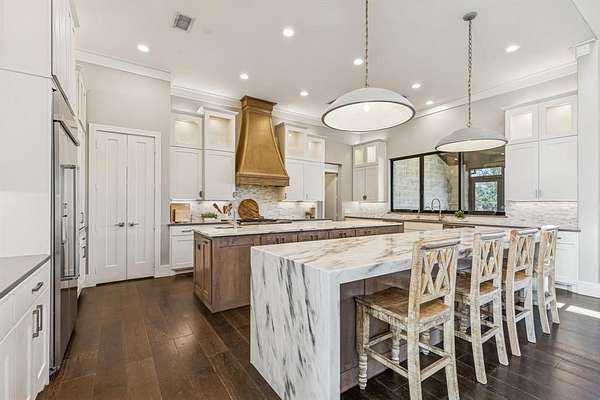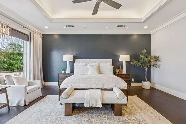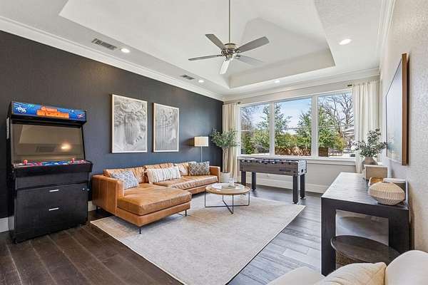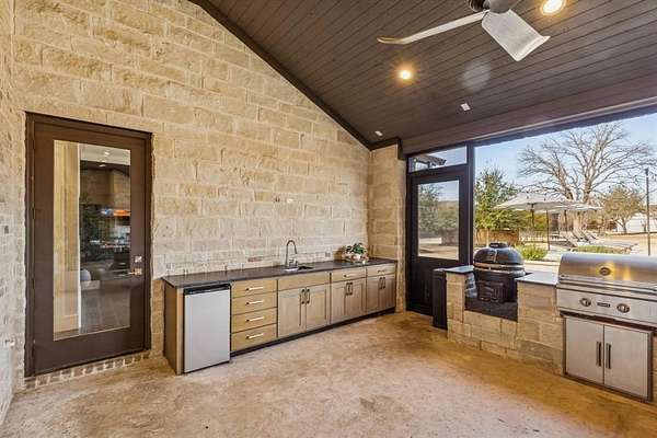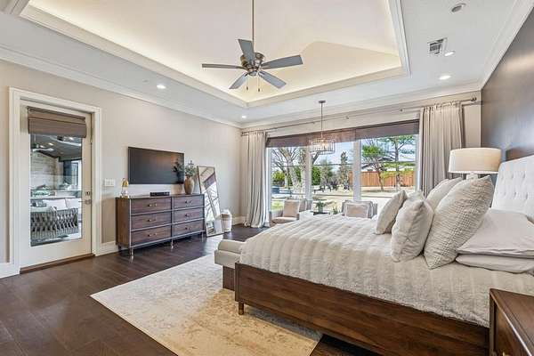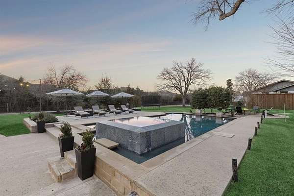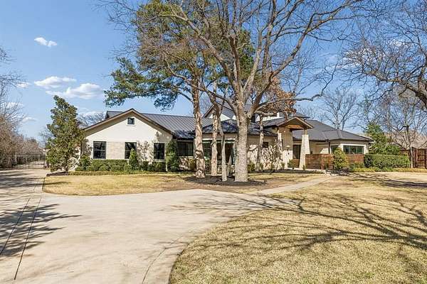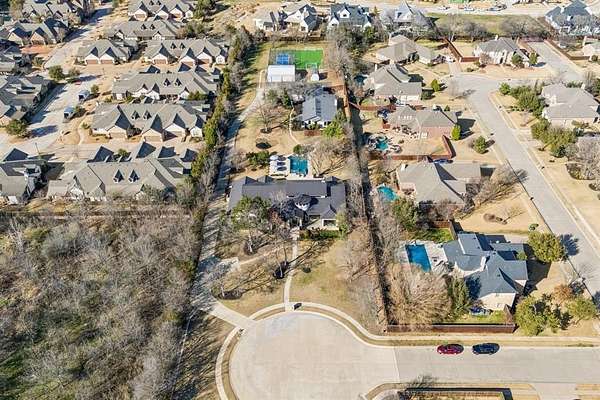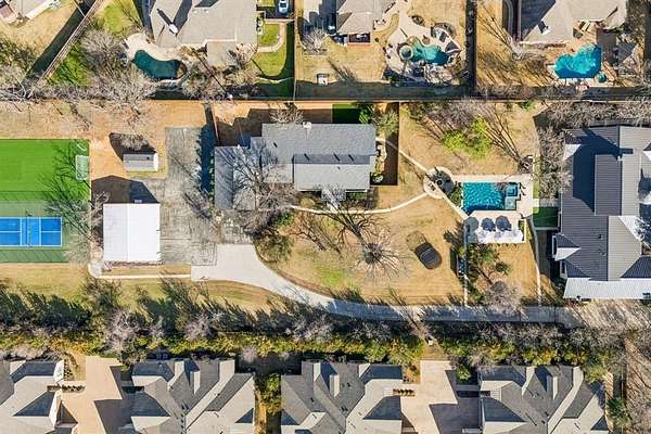 Set on 2.3 fully fenced, usable acres in private Southlake cul-de-sac, this rare modern estate delivers an almost impossible combination: land, Carroll ISD open enrollment, a newer custom home, no HOA, and resort-style amenities at a value well below replacement cost. Built in 2016, the single-story main residence was thoughtfully designed for modern living and effortless entertaining. A light-filled, open floor plan flows seamlessly to the outdoors through massive panoramic sliding doors, opening to a covered patio with new motorized screens, creating true year-round indoor-outdoor living. The main home features three oversized, master-sized bedrooms, each with en-suite baths, a dedicated office, and a generous bonus space that can easily convert to additional bedrooms, media, or flex living, offering long-term adaptability without compromise. Additional highlights in the main home include, foam insulation, a full house water filtration system, EV charger, stack dishwasher, separate laundry room in primary bedroom, and thermostats in each bedroom for added convenience. Outdoors, the property truly distinguishes itself. The grounds are fully utilized and designed for lifestyle, featuring mature hardwood trees, a turf soccer field, brand-new fenced pickleball court, expansive play areas, a resort-style pool and spa, and a storage barn for recreational gear and equipment, all within a setting that feels private, peaceful, and rare for Southlake. With no HOA, sidewalks leading to nearby walking trails, and a quiet cul-de-sac location, the setting offers both freedom and refinement. As a bonus, the estate includes additional independent living quarters, ideal for multi-generational living, guests, or future flexibility without detracting from the primary home's elegance and cohesion.