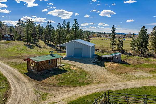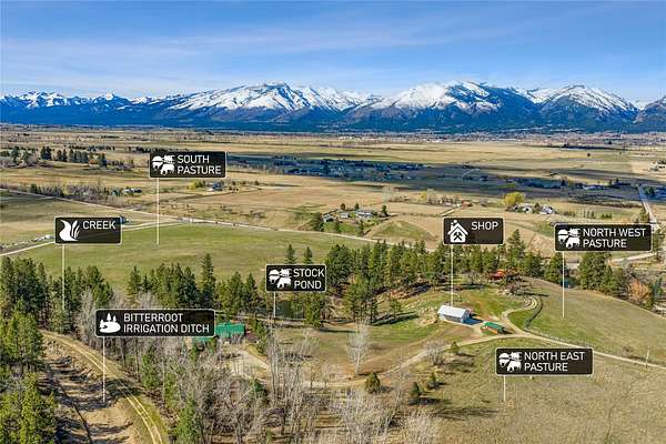 Discover a rare legacy holding in Corvallis offering 31+ acres of scenic, highly usable land with exceptional water resources, infrastructure, and privacy. Owned by the same family for more than 55 years, this property offers productive agricultural ground with inspiring natural beauty and future potential. Revive one of the existing structures or create your dream home from the ground up in an remarkable Bitterroot setting. Approximately 24 acres are currently dedicated to grazing and agricultural use, thoughtfully divided into three separate pastures. Comprised of two legal parcels and fully suited for livestock and horses, the property includes existing fencing and a chicken coop. A spring-fed 1.8-acre stock pond, a tributary creek from Baptiste Creek, three active water rights, and direct access to the Bitter Root Irrigation District ditch along the property's edge create an exceptional and rare water profile. Infrastructure is already in place with a shared well (featuring a new pump), private permitted septic, pump house, and fiber optic service. A newly built 36' x 38' shop is wired for electricity and features an automatic door, plus a generous overhang ideal for covered equipment, tractor, or RV storage. The setting is equally impressive, with a forested buffer along the eastern fringe, striking granite boulders, fruit trees, and sweeping panoramic mountain views that enhance the tranquility and privacy of the land. Smooth paved access leads directly to Weber Butte Trail, ensuring year-round convenience without sacrificing seclusion. Existing structures on the property offer salvage potential for materials or future projects. Only a short drive to medical services, shopping, dining, and the renowned Stock Farm Club in Hamilton. This rare legacy property offers water, usability, and sweeping views in one of the Bitterroot Valley's most desirable settings.
