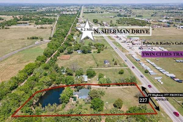 3.049 +- Commercial Eligible Acres with over 225 feet of Highway 377 frontage. Now available for the first time in over 50 years, positioned directly in the path of opportunity. Not located in Flood Zone and Outside City Limits. East facing Prime location with immediate proximity to N. Sherman Drive, FM 455, Springhill Road and US HWY 380 known as the North Texas most active Commercial Corridors. This offering includes the opportunity to acquire the 3.049 acre tract, one of two contiguous parcels. The adjoining 2.716 Acre parcel is not for sale at this time and not included in this offering. Currently zoned residential this rare property is surrounded by expanding infrastructure and ongoing residential development, this location offers both immediate access and long term upside for investors, institutional assembly and commercial users. With planned TXDOT 6-lane highway expansion, this property is set to benefit from increased traffic counts, enhanced visibility and long term commercial viability. New owners will receive the eminent domain compensation from TXDOT partial acquisition which consists of. approx 5,7678 sq ft. See offering memorandum. As infrastructure drives development, sites like this become key anchors for future retail, service or mixed use projects to cater to the surge of new residential development. Structured with a one-year lease back to Seller this income producing property has a residential 4 bedroom 3 bath with recreation room single family home or office and propane heated pool. Well-suited for an owner-operator looking to establish a flagship presence. Buyers are encouraged to conduct independent due diligence to verify all information. Owner occupied. This property is subject to eminent domain. Information uploaded in transaction desk Please contact Listing Agent Ashlee Luna for additional questions or to schedule a tour. Survey available.