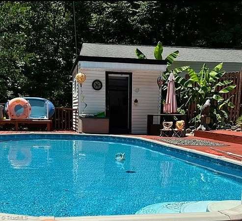 This beautiful 4BD, 4BA home is nestled on a peaceful 4.15 acre wooded lot in sought after Stokesdale, NC, including adjoining lot 8293, offering privacy, space, and endless potential. A large deck off the kitchen overlooks the above-ground pool with a custom surrounding deck, creating a perfect setting for outdoor entertaining. The finished basement features a game room with pool table, wet bar, and soft heat sauna, ideal for hosting or relaxing. A separate workshop includes two floor bolted gun vaults, and the property offers 3 garage spaces suitable for parking, a workshop, storage, or hobbies. Additional storage with a huge floored attic.