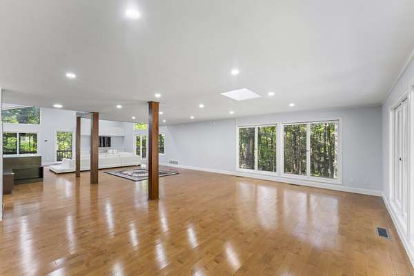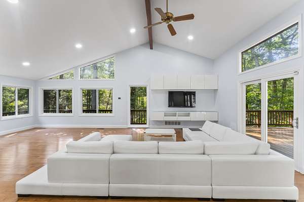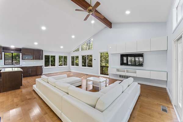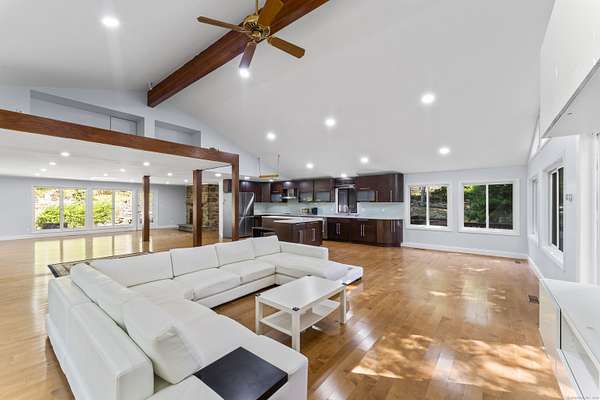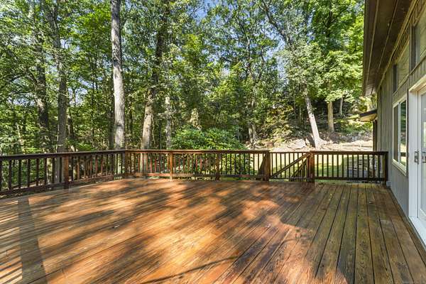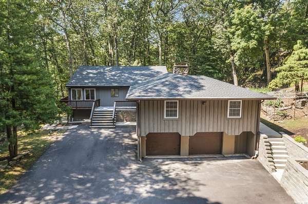 Tucked into the quiet elegance of Lower Easton, 83 Buck Hill Road blends mid-century modern design with thoughtful contemporary updates. Set on 3+ private wooded acres, this striking ranch offers light-filled living and serene views throughout. The main level features a dramatic great room with vaulted ceilings, exposed beams, and oversized windows that invite the outdoors in. A chef's kitchen with custom cabinetry, stainless steel appliances, and an oversized island flows into open dining and living areas-ideal for entertaining. The spacious primary suite includes treetop views and an updated en-suite bath. Two additional bedrooms share a modern full bath, plus there's a guest powder room, laundry/mudroom, and a partially finished lower level with fireplace perfect for a gym, playroom, or media room. Enjoy the expansive wraparound deck, two fireplaces, and room to expand or garden-all just minutes from the Merritt Parkway, hiking trails, farm stands, and top-rated schools and commute to NYC!