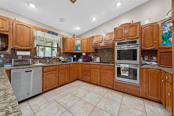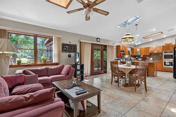 Welcome to your private retreat, perfectly nestled on 4.6 scenic, park-like acres in the heart of the Pine Bush School District. This 1 owner home has 3 bedrooms 2 baths on 1st level, screened in porch off kitchen, enormous living room offers plenty of room for the whole family plus extended family and is ideal for those who love to entertain or simply enjoy the peaceful Hudson Valley lifestyle. Living space featuring cathedral ceilings and an open-concept design that seamlessly connects the living room, dining area, and modern eat-in kitchen. The kitchen boasts granite countertops, a double wall oven, stylish tile floors, and a contemporary backsplash, a perfect setup for both casual meals and holiday gatherings.