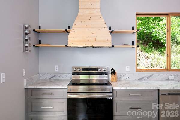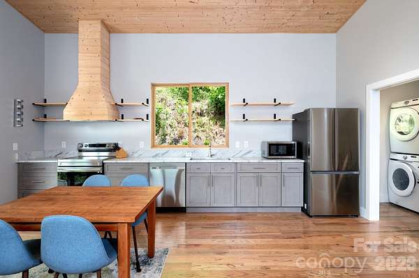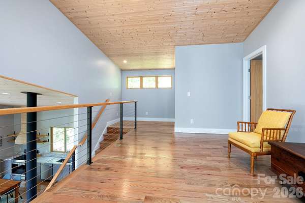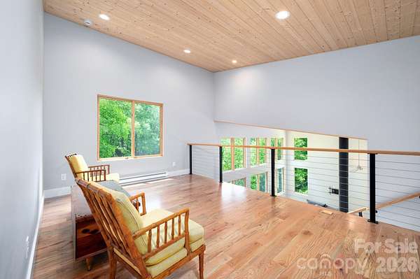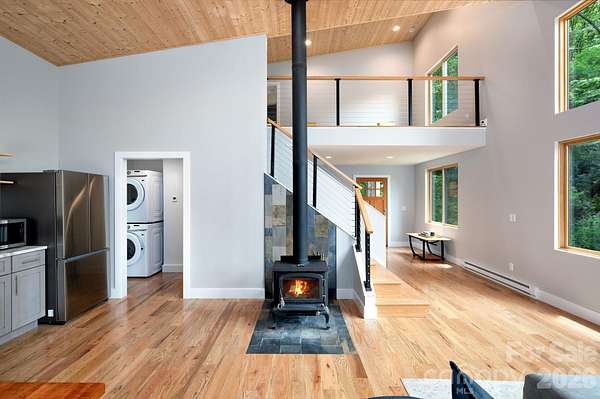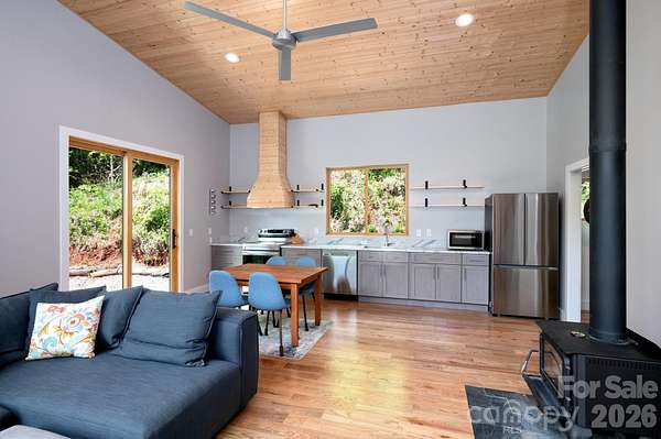 Spectacular winter long range mountain views are now visible from the main house!! This unique 7.66-ac lot borders Sandy Mush Game Lands and includes a second build site with long range mountain views, driveway, electric, and individual well/septic in place. Meticulously designed to bring the outside in, large picture windows bathe this home in natural light. Solid oak floors and wood ceilings anchor the quality of finishes throughout. Stay cozy year-round with a centralized wood-burning stove. Unwind on the covered front porch or back patio with firepit. Enjoy foraging for raspberries/blackberries. Hike out your door to over 200 acres of national forest. Form meets function with solar ready roof, double wall insulation, and sealed, climate controlled crawlspace. Appliances included and furnishings are negotiable making this cabin move-in ready. 5 min to Grateful Roots Market, Longleaf or Addison Farms Vineyards. $20k credit at closing with acceptable offer toward minisplit installation to bring central air into the home.