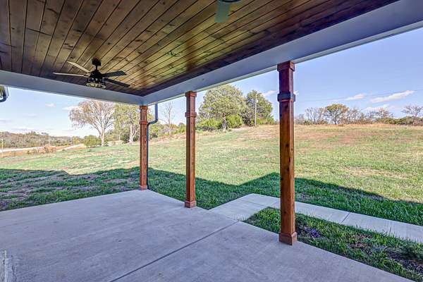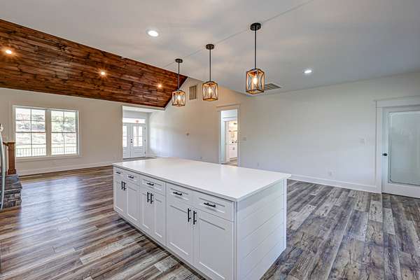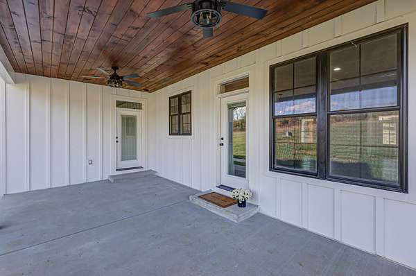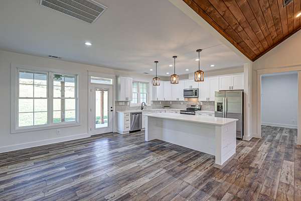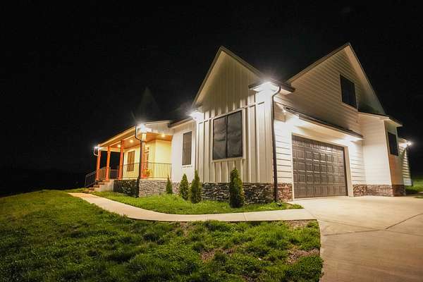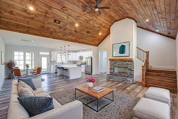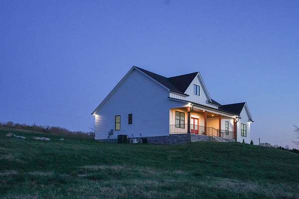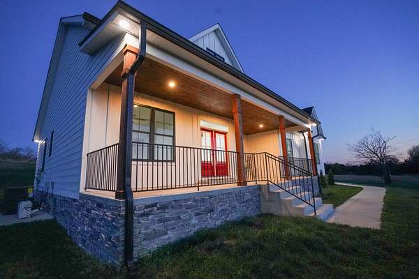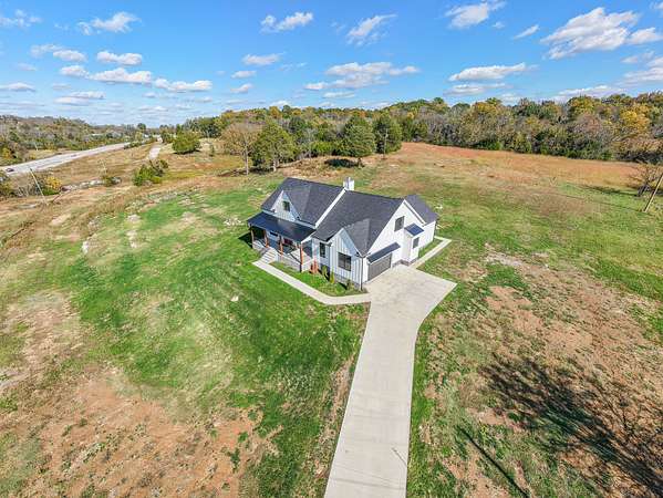 Custom-built home on 5.05 scenic acres in Wilson County, just 7 miles from Lebanon Square, offering peaceful country living with convenient access to shopping, dining, and city amenities. Designed for primarily one-level living, this home features 3 bedrooms, 3 full baths, and an upstairs flex room or office with its own full bath. High-end finishes and designer details shine throughout, including shaker-style cabinetry, quartz countertops, stainless steel appliances, tiled bathrooms, abundant storage, and a 10-foot island. The vaulted living room is filled with natural light and showcases a tongue-and-groove wood ceiling and stone wood-burning fireplace. The primary suite features a 10-foot tray ceiling, walkout access to the back patio, and an attached storm room or panic room. Additional highlights include a mudroom and laundry room with shaker-style cabinetry and utility sink, oversized 2-car garage, and encapsulated crawlspace with dehumidifier. Covered patios overlook the rolling acreage, which includes approximately 800 feet of road frontage, a spring, an old well, and space to expand a pond area.