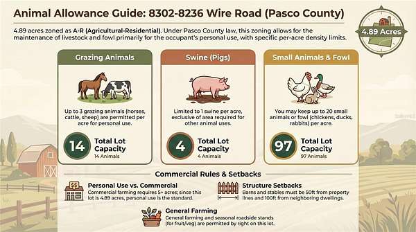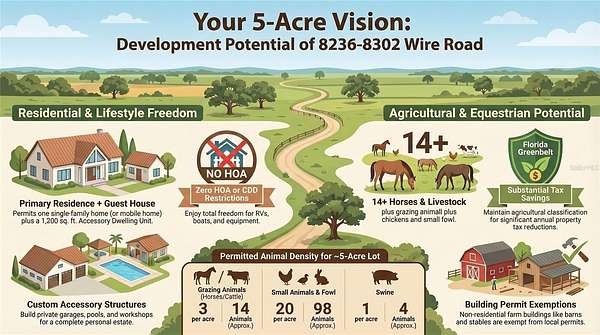 One or more photo(s) has been virtually staged. LAND-VALUE OPPORTUNITY. Existing structures on the property, including the mobile home, are conveyed as-is, with the asking price based largely on the underlying land and its potential use.— 4.89 ACRES of Florida countryside just ten minutes from the Two Rivers master-planned community, and the rare kind of land serious buyers have been waiting months, sometimes YEARS to find. Picture your CUSTOM DREAM HOME rising from the center of your own Florida acreage, a resort pool shimmering in the backyard, a detached guest cottage tucked under the oaks. Picture waking up and walking out to your own garden, coffee in hand, picking fresh tomatoes still warm from the morning sun and basil straight from the earth for tonight's dinner. Picture the fruit trees you've always wanted — citrus, avocado, peach, mango, whatever your heart chooses. YOUR LAND. YOUR HARVEST. Picture horses grazing in the back pasture, a private equestrian facility with stables and a round pen, the little ones riding before breakfast across fields you own. Picture chickens in the coop, goats in the paddock, a green house filled with year-round vegetables, and enough room for every animal, every tree, and every dream you've ever had about what living on real land should feel like. Picture a SEPARATE GUEST HOUSE OR DETACHED WORKSHOP or GARAGE built to your specifications — large enough to hold every car, boat, RV, or tractor you own. This is room to breathe. Room to build. Room to grow. This is the life your doctor has been telling you to live. Get outside. Breathe clean air. Let the little ones play in the dirt. Watch the stars come out at night with NO CITY LIGHTS washing them out — out here, there are MORE stars than you ever thought possible. AGRICULTURALZONING with FLORIDA'S GREENBELT TAX CLASSIFICATION already in place means substantial property tax savings year after year for as long as you maintain agricultural use. NO HOA. NO CDD. NO architectural review board. Just YOUR land, YOUR sky, and the freedom to build a life no HOA community in Tampa Bay can ever share. FOR BUILDERS AND DEVELOPERS: Beyond a custom single-family estate, this parcel carries aRES-3 FUTURE LAND USE DESIGNATION — creating potential rezoning opportunities for qualified buyers pursuing higher-density development. Amini-community, townhomes, or a small residential project may be possible through formal application with Pasco County Planning. The SELLERWILL REMOVE ALL VEHICLES, EQUIPMENT, AND PERSONAL ITEMS FROM THE PROPERTY PRIOR TO CLOSING ALSO AVAILABLE — THE CUSTOMLUXURY ESTATE NEXT DOOR: The adjacent 4.94-acre parcel at 8241 Cass Road features a CUSTOM 2020 LUXURY HOME — 5 bedrooms, 4 full and 3 half baths, 7,521 square feet. Both parcels can be purchased SEPARATELY OR AS A COMBINED 9.83-ACRE FAMILY COMPOUND — one of the rarest multi-generational legacy opportunities in all of Pasco County. Once this combination is gone, it is GONE. Ten minutes to Two Rivers, where shopping, dining, and everyday conveniences are just a short drive away. Twenty minutes to The Shops at Wiregrass for family dinners, weekend coffee, and the kind of afternoons the little ones remember. And when the weekend calls for adventure, the interstate is minutes away— ready to take you to beaches, theme parks, or anywhere your family wants to explore. THE LAND IS YOURS. The freedom to build every dream you've ever had is waiting. Make it yours before it’s gone.