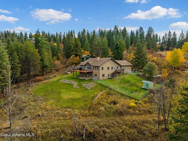 If you're ready to trade traffic, noise, and crowded streets for quiet mornings and open sky, this is the place. Nearly 20 private acres - the largest parcel on Drummond Mountain -offer room to breathe, think, and live at your own pace. Only 2 miles to I90 for easy access to downtown Coeur d'Alene and everywhere you need to be. Wake up to sweeping Coeur d'Alene River Valley views, unwind by the warmth of a stunning stone hearth, and enjoy a lovely home custom designed by a fire chief for both comfort and safety. The vaulted great room, spacious kitchen with butler's pantry, and main floor primary suite create a peaceful everyday retreat. A bright walk out basement adds flexible space for whatever your lifestyle needs. A 24x36 shop, greenhouse, fenced garden, fruit trees, and full backup power system support a more self reliant lifestyle. No CCRs or HOA - just quiet, views, and room to live the way you want. You knew something better was out there. You were right. Here it is!