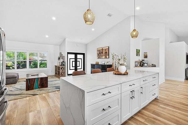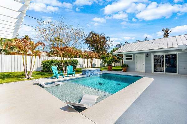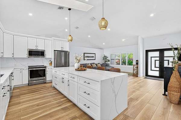 Stunning Renovation of this open concept 3 Bedroom, 3 Bath Home in the sought after Gomez Grant section of Hobe Sound. Gorgeous New Gourmet Island Kitchen defined by Shaker Cabinets, Quartz Countertops & Stainless Appliances, Beautiful New Baths & Flooring, Spacious Master Suite, Laundry Room w/ Custom Cabinetry, Quartz & Soak Sink, Metal Roof, Impact Windows & Doors, Plantation Shutters, Plus, an Exquisite New Open Air, Heated, Saltwater Filtration Pool, Trellis & Fully Fenced Backyard. All nestled on a Fabulous 1/3 acre, professionally landscaped & lighted, Cul de sac Lot with 15 different types of fruit trees. A Private Oasis & Spectacular Lifestyle!