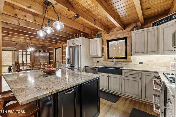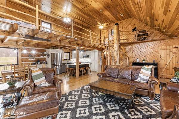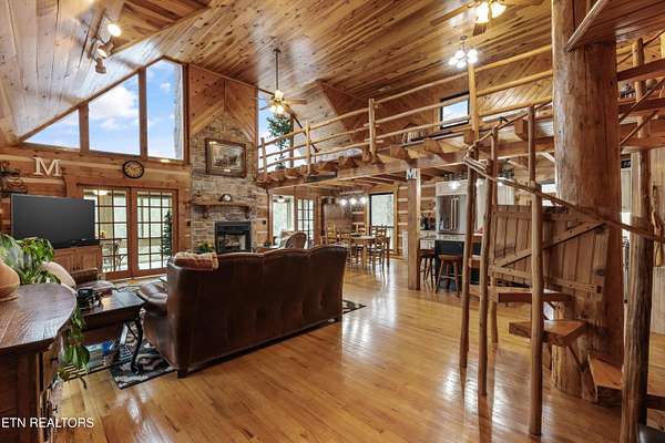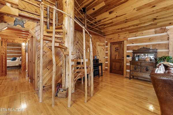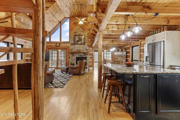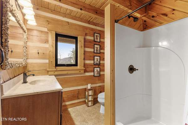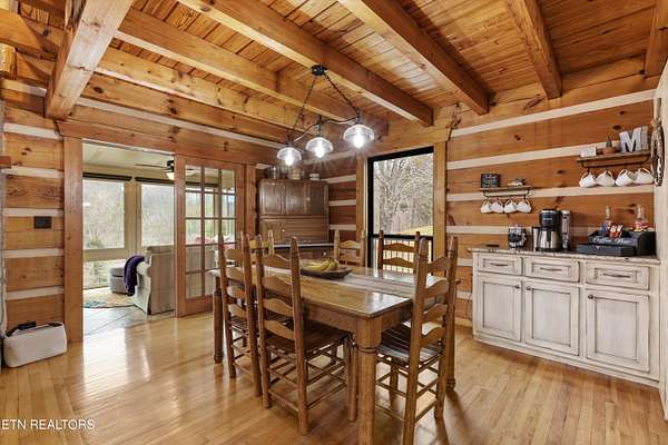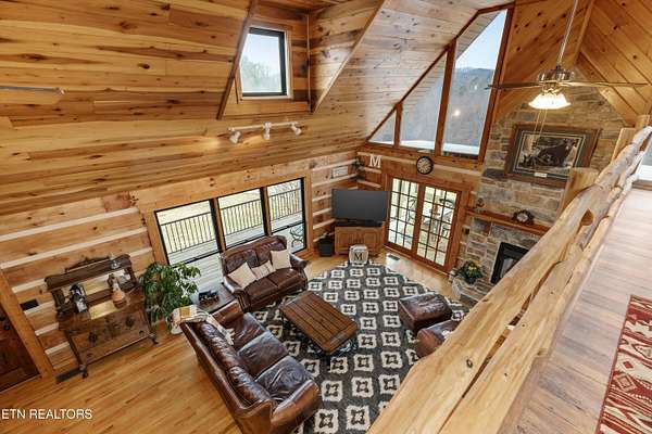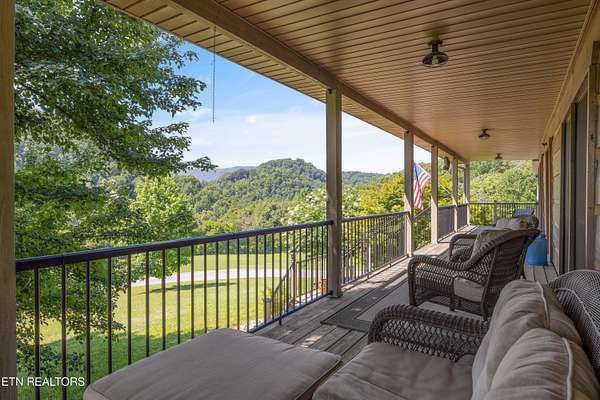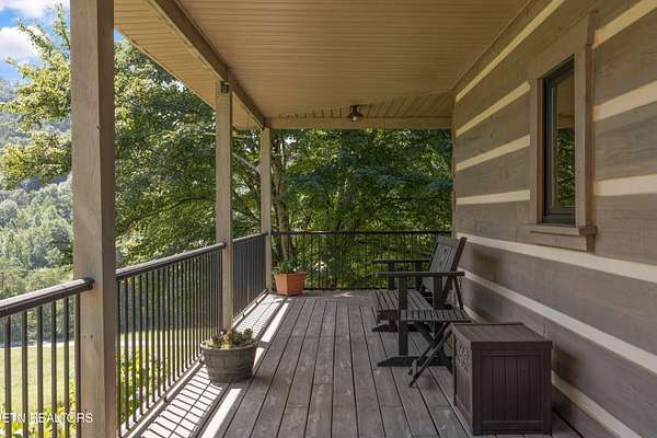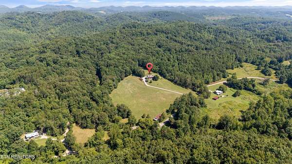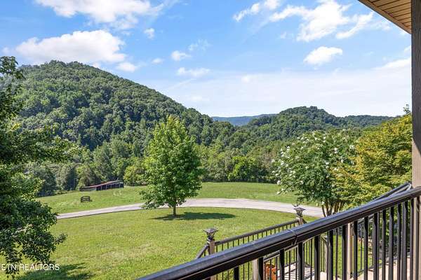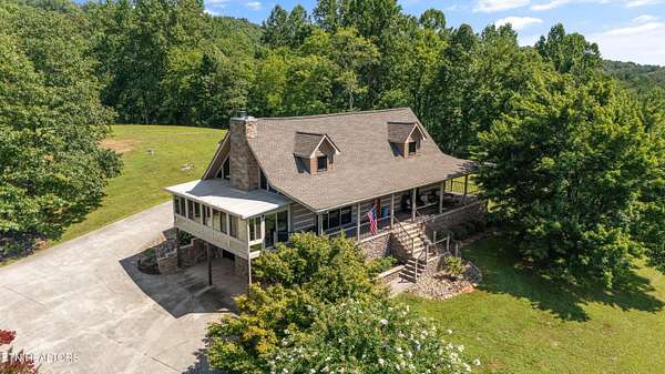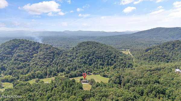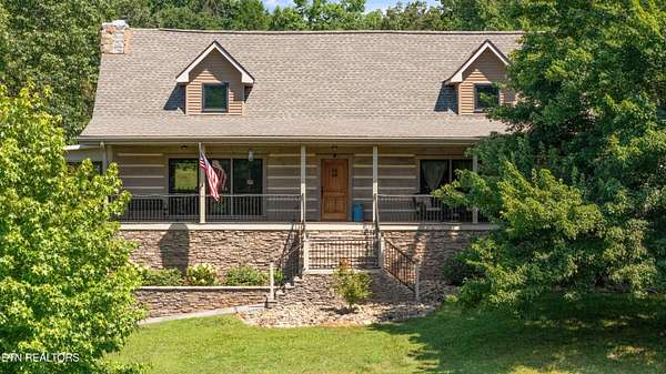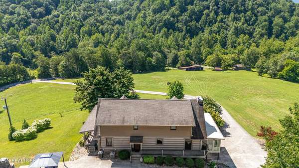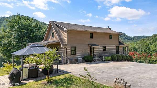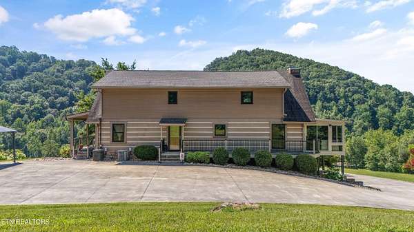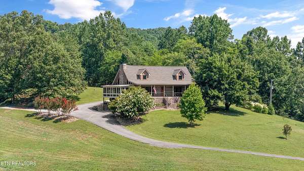 Looking for a log cabin with land in East Tennessee? This 45+/- acre property in Tellico Plains offers privacy, mountain views, and two homes. The main log home (built 1996, approx. 2,742 sq ft) features 3BR/2.5BA, an open floorplan, cathedral ceilings, stacked stone propane fireplace, and large windows. Kitchen fully renovated in 2023 with granite countertops, stainless appliances, farmhouse sink, island, and updated cabinetry. Main level includes 2BR, 1.5BA, and laundry with exterior access; loft den, bedroom, and full bath upstairs via spiral staircase. Covered front porch and enclosed sunroom provide year-round outdoor living. Unfinished walk-out basement with 1-car garage, storage, and secured space under porch for tools/equipment. Updates include well pump (2023), windows (2022), roof (approx. 7 years ago), and porch railings/stacked stone (2019). Second home (approx. 900 sq ft) is ideal for guests, rental, or multi-generational living. Property includes smokehouse and 6-bay implement shed. Minutes from downtown Tellico Plains, the Cherohala Skyway, and the Cherokee National Forest. Buyer to verify all information.
