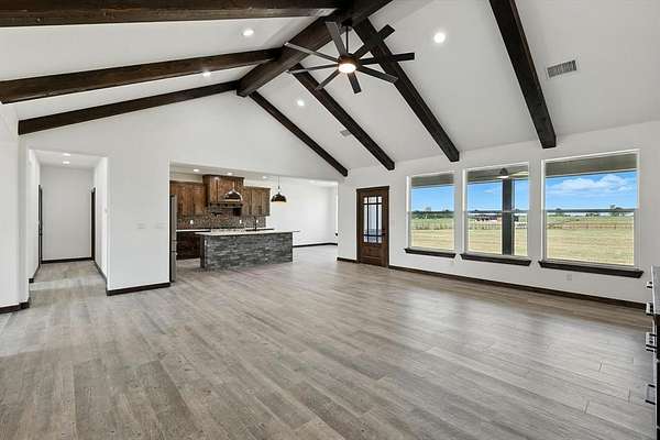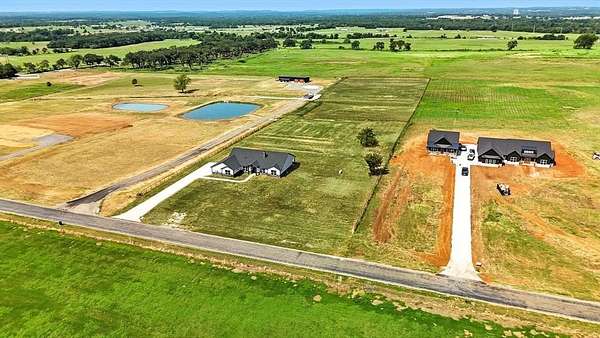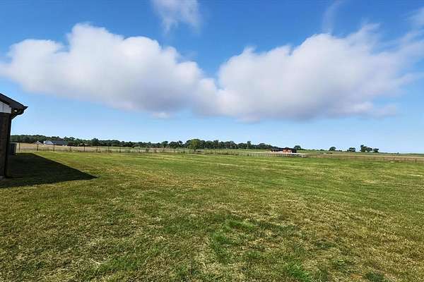Situated on 4.88 acres of serene pasture land in the new Club Lake Ranch addition of Whitesboro, this custom built home blends southwestern style and modern finishes. Right of the foyer is a generously sized office with a breathtaking view of the rolling ranch across the street. Further inside, you are greeted by a comforting aesthetic and ideal layout, with an open concept kitchen and living area featuring natural wooden beams positioned on the vaulted ceiling, custom built ins and cabinetry with a richly stained finish, wood burning stove, large kitchen island with designer light fixtures, and a commercial grade, gas range. The expansive primary bedroom boasts a private oasis of a bathroom with a huge shower and elongated vanity featuring dual sinks and ample cabinet storage. On the opposite side of the home are the two guest suites, each with walk in closets, and a separate full bath offering a unique layout to allow for both privacy and functionality. The utility area close to the garage is fully equipped with a custom mud bench and storage, half bath, and oversized laundry room with plenty of space for additional cabinetry, hanging racks, or refrigerators. Out back is an exceptional covered porch overlooking the beautiful pasture with ample lighting and ceiling fans, making it an ideal entertainment spot, or for relaxing after a long day while watching the sunset in the west. The property is fully enclosed with pipe and no climb fencing, with cross fencing already installed for animals. Enjoy the convenience of being just a short drive to downtown Whitesboro, schools, or parks, all while embracing the feeling of being out in the country.