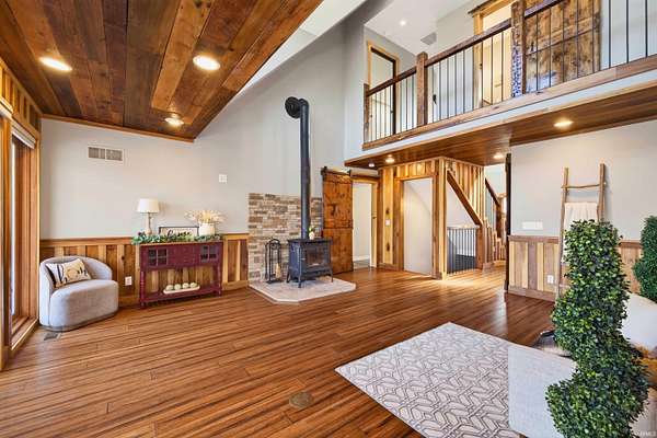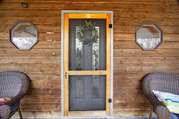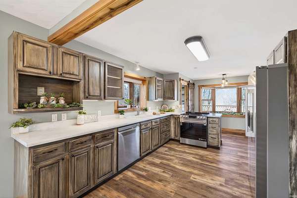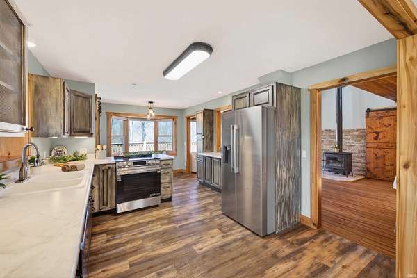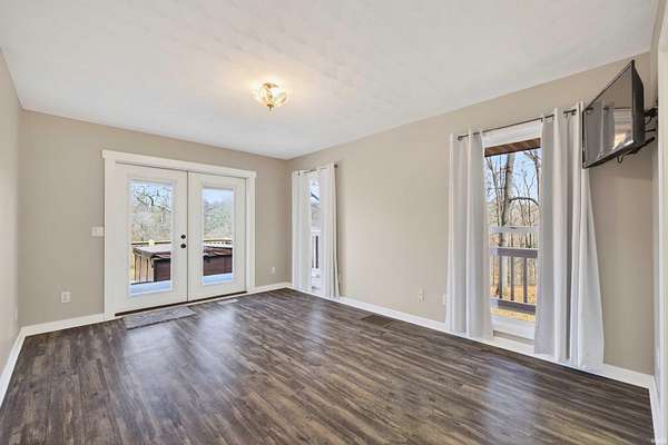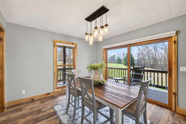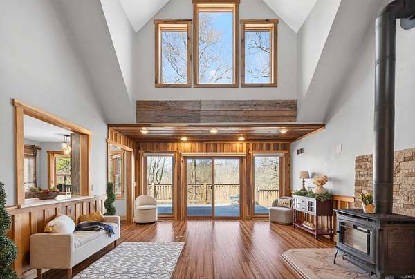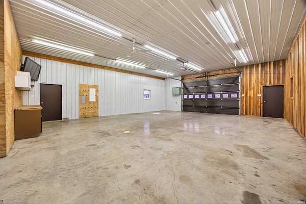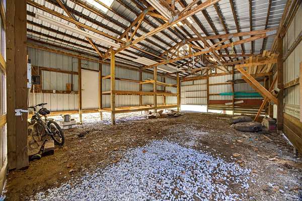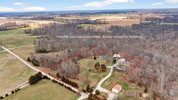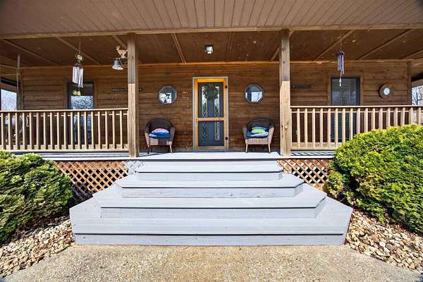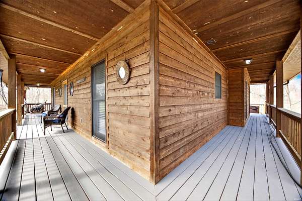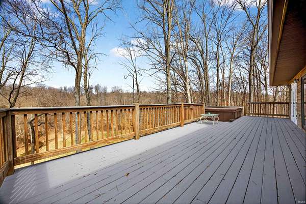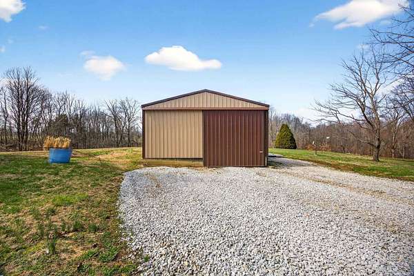 SECLUDED. EXPANSIVE. SERENE. This spacious FIVE bedroom, 3.5 bathroom, one-and-a-half-story home sits on 45.59 partially wooded acres, offering exceptional privacy and peaceful country living. Set well back from the road with a long private driveway, the home provides a secluded and welcoming setting surrounded by nature. A scenic creek flows through the property, adding to the beauty and tranquility of the land. Step onto the wraparound front porch with a porch swing, the perfect place to relax with your morning coffee or unwind while taking in the countryside views. Enter through the front door into a welcoming foyer area. To the left, you will find a spacious kitchen filled with natural light that flows into the living room featuring a cozy fireplace. Sliding glass doors lead to the back deck, where you can enjoy the hot tub and beautiful views of the property. Also located on the main level is the primary suite, offering convenience and privacy. Upstairs are two additional bedrooms and a full bathroom. The basement provides even more living space with a family room, laundry room, two bedrooms, and another full bathroom. Just off the laundry room is a safe room, adding an extra level of security and functionality. Additional features include a 55' x 31' detached two-car garage with a kitchenette, stove, stand-up shower, and utility sink, making it ideal for hobbies, guests, or workspace. The property also includes two outbuildings, a 37' x 23' building with four animal stalls and another 39' x 24' outbuilding, providing excellent space for livestock, storage, or equipment. Recent improvements include metal siding added to the upper level in July 2023, along with new upper-level windows and new gutters installed by Precision Gutters. A deck addition and hot tub were added in 2023. In 2024, the kitchen, dining room, and pantry received new flooring and paint, and the entire upper level was painted. Additional updates include upstairs bathroom flooring (2025), deck painting (2025), and new flooring in the master bedroom and bath (2021). In 2026, new kitchen countertops and brand new appliances were installed, along with paint updates to the master bedroom and bathroom, a new shower door, new interior and exterior light fixtures, a basement bathroom toilet and pump replacement, and new hardware on upstairs bedroom and closet doors. Utilities are provided by Jackson County REMC, Jackson County Fiber, and Jackson County Water.