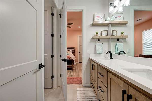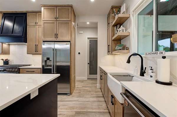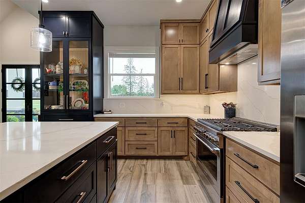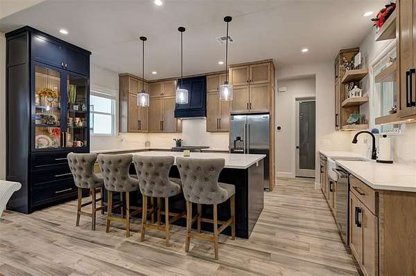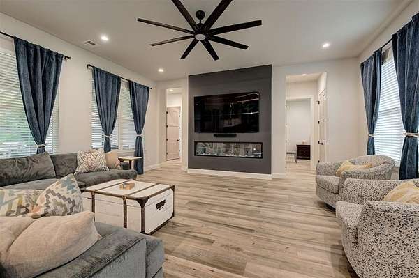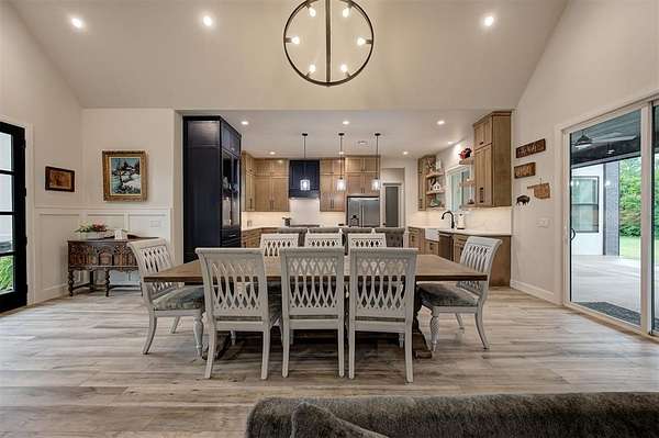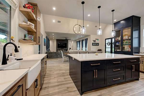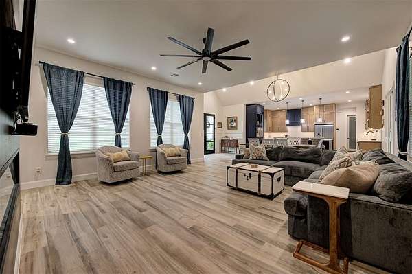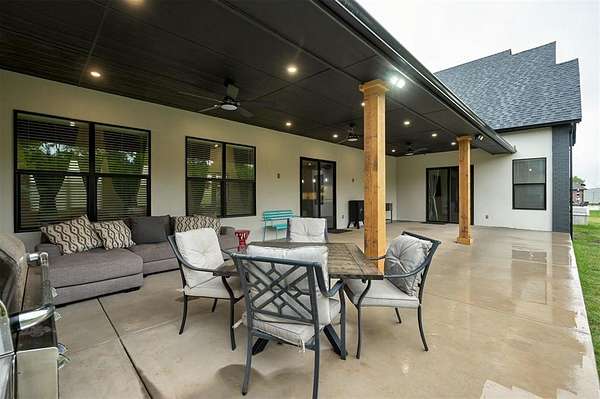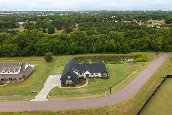 Step away from the hustle and bustle and into your dream home! Situated on a nearly 2-acre lot with its own private stocked pond, this custom-built home is brimming with luxurious details, features, and amenities. The large front porch features a modern, double-door entry leading you into a soaring cathedral ceiling view that invites you to look straight into the breathtaking backyard where you will find a nicely stocked pond. Love to host or whip up fabulous meals? This kitchen is expansive enough to hold every party you've ever dreamed of hosting. The walk-in pantry is complete with outlets and counter space--a home for all your kitchen gadgets and appliances where they are plugged-in and ready for use and tucked away from view! The island is perfect for serving buffet style or just to enjoy a meal. There are three amazing living areas in this home: the living room featuring an 80" modern LED fireplace, the massive outdoor covered patio with outdoor sink, and the large bonus room upstairs that has its own bath and oversized closet. The primary suite is located in its own wing for ultimate privacy and features its own soaring cathedral ceiling with wooden beam, door to patio and en-suite bathroom that will exceed all expectations! The primary closet is equipped with tons of drawers and shelves and conveniently leads into a spacious laundry room. Two bedrooms share a "Jack-and-Jill" bathroom and have walk-in closets, while another bedroom is positioned as a "mother-in-law" suite for guest privacy. This home also features an oversized 4-car garage that is dream for those who want a workshop or hobby space. The garage comes equipped with electric hookups for two electric vehicle charging stations and a walk-in storm shelter tucked neatly under the stairs. Other luxury details include: Spray foam insualtion for superior efficiency, Instant Hot Water, Sprinkler System, Class 4 Shingles, Soft Close Hinges, and Designer Finishes. Shops allowed! Must see!