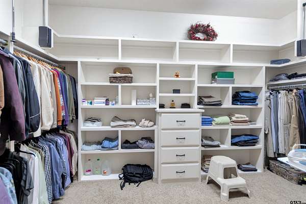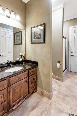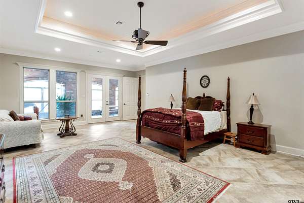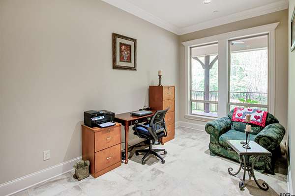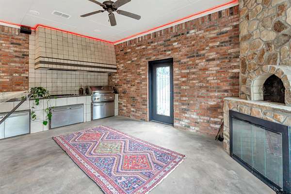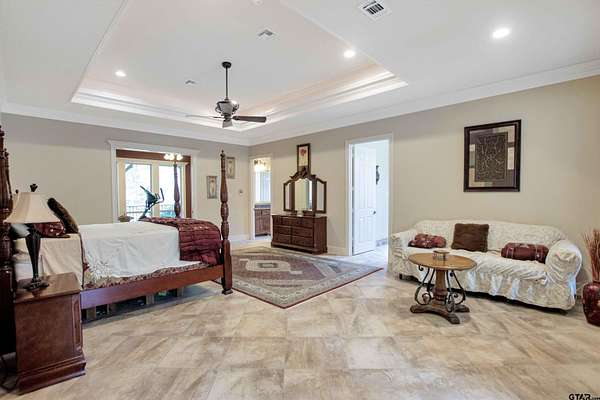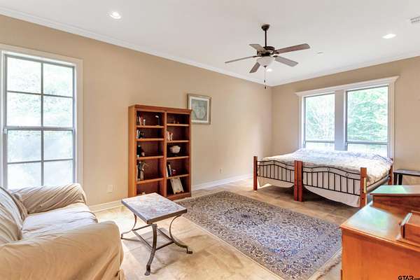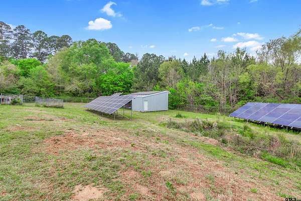 Welcome to an absolutely one-of-a-kind estate in Flint offering 4 bedrooms, 5.5 bathrooms, and a 3-car garage across 6,247 square feet, all set on expansive acreage. Tucked away in a private, serene setting, this home offers unmatched character while still being minutes from Tyler and Bullard. Energy-efficient features include geothermal HVAC, a new composite roof, 33kW paid solar panels, and propane backup systems. Inside, a grand entry welcomes you with a stunning fireplace and intricate details throughout. The spacious kitchen features beautiful countertops, custom cabinetry, and opens to the main living area with another fireplace and backyard views. Additional features include central vacuum, wired audio, intercom, LED cove lighting, and video security. A flexible office space and entertainment room with wet bar offer versatility, along with a dedicated gym and library. The primary suite is a true retreat with direct sunroom access, while the ensuite bath offers ample space to unwind. The sunroom includes an outdoor kitchen and furnace for year-round use. Bedrooms and bathrooms are generously sized, including a private suite with its own kitchen and exterior access—ideal for guests or multigenerational living. The home includes two wood/gas fireplaces and one gas-only. Outside, enjoy agriculturally exempt acreage with chain-link and barbed wire fencing, a barn with tack room, and a private well for irrigation. A water softener and reverse osmosis system add convenience. The garage includes two EV chargers, a Tesla Gateway, and storage rooms. Additional highlights include 5G+ internet, tankless propane water heaters, foam insulation, zoned geothermal heating, and tile flooring throughout. This exceptional property offers space, efficiency, and privacy in a truly unique setting.