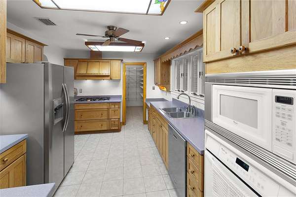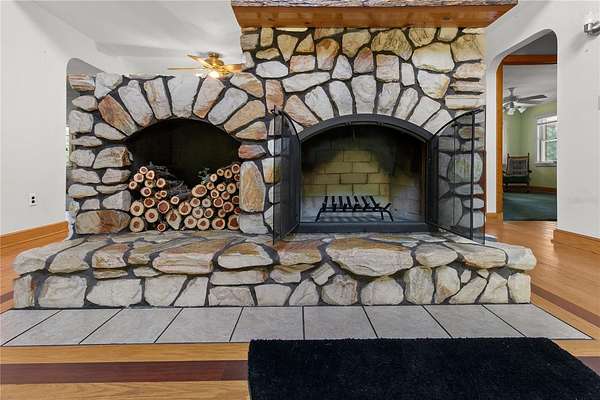 Inside, the home is light and bright with an abundance of windows that fill the space with natural light. You'll find warm, welcoming rooms highlighted by a beautiful stone, wood-burning fireplace, high ceilings, and a thoughtful split-bedroom layout. The kitchen has been updated with new stainless steel appliances and features a huge pantry, perfect for storage and entertaining. Two hot water heaters provide comfort and convenience for everyday living. For added peace of mind, custom hurricane window covers are included for every window.