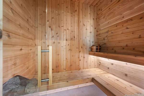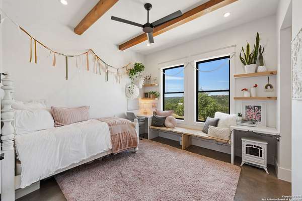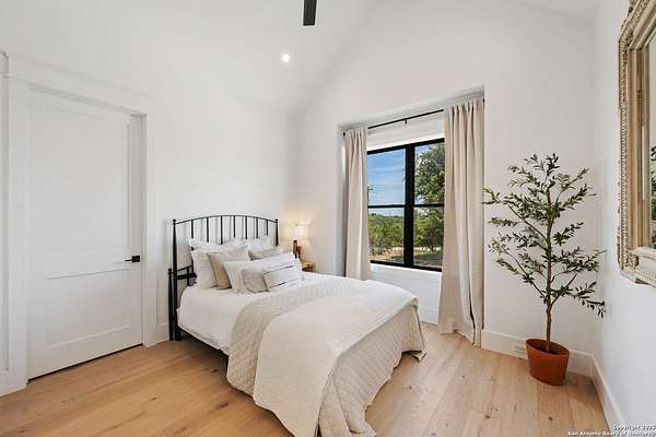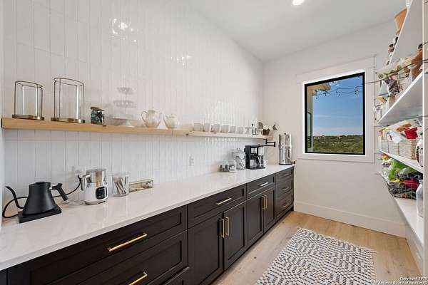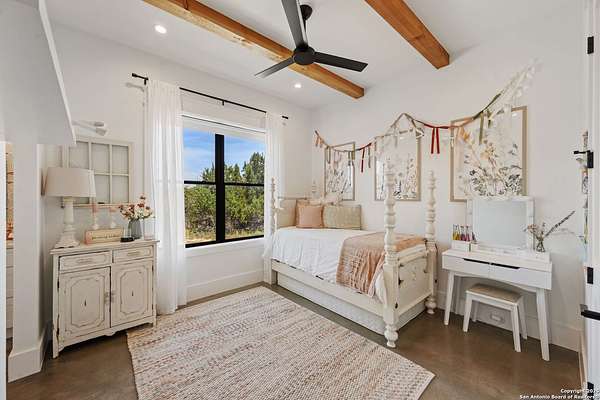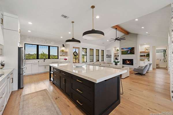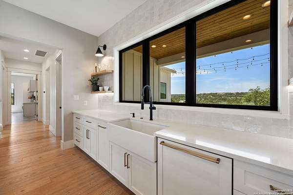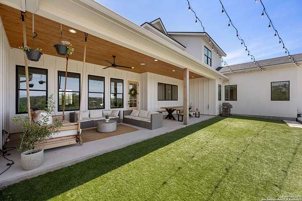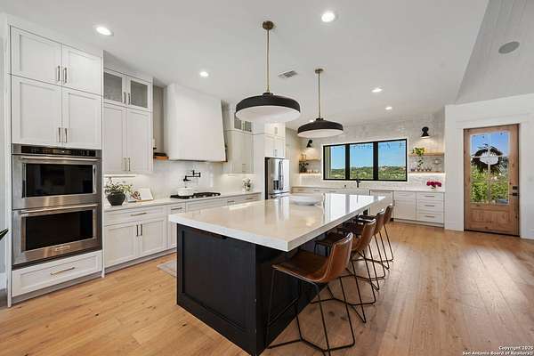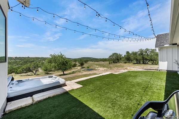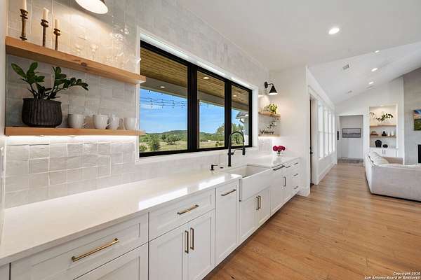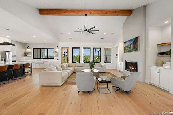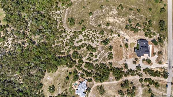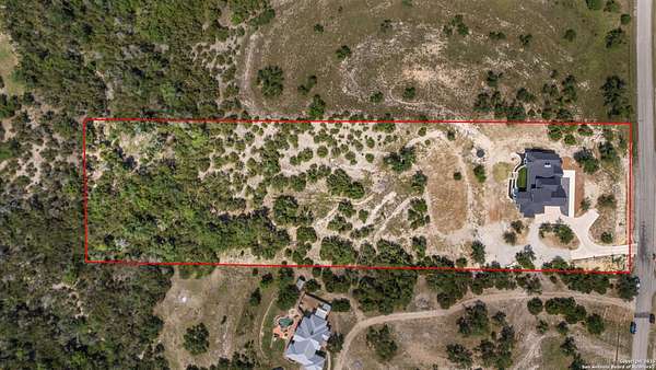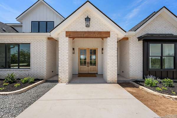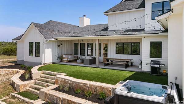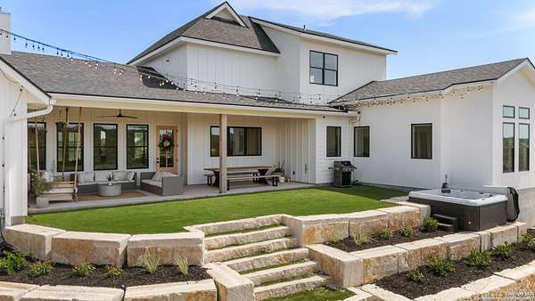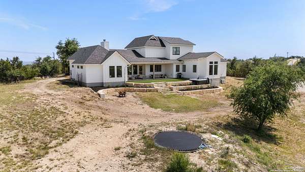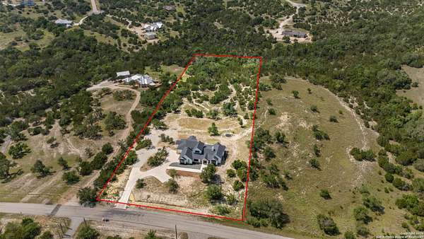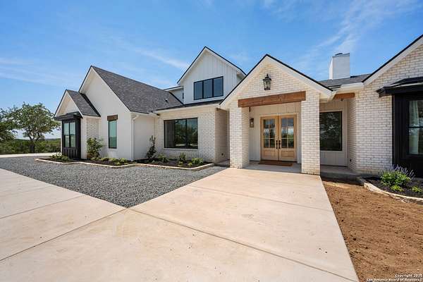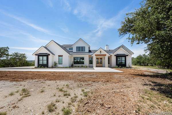 Welcome to 837 Mystic Breeze, an exceptional modern farmhouse built in 2023, nestled atop a hillside in the prestigious Mystic Shores community in the TX Hill Country. This 5-bedroom, 4-bathroom custom home offers 4,112 sq ft of beautifully designed living space on a serene 5.14-acre lot, blending luxury, comfort, and sweeping Hill Country views. The property welcomes you with a gated entrance, oak trees, and sustainable rock landscaping. Inside, tall ceilings with exposed wood beams, expansive windows, and wide-plank wood flooring create a warm and open atmosphere filled with natural light. The heart of the home is the spacious living and dining area anchored by a wood-burning fireplace with gas start. Perfect for entertaining, the open-concept layout flows seamlessly into a gourmet kitchen featuring quartz countertops, an oversized island, propane gas cooktop, electric double ovens, pot filler, farmhouse sink, microwave, dishwasher, and custom cabinetry. A generous butler's pantry adds functionality with custom cabinets, shelving, and a built-in coffee and tea bar. Designer lighting and ceiling fans throughout the home add a polished, cohesive feel. The primary suite is a peaceful retreat with a sitting area, high ceilings, and large windows framing spectacular views. The luxurious en-suite bath offers dual vanities, two walk-in closets, and a spa-style walk-through tiled shower with dual shower heads. A rare highlight is the glass-enclosed dry sauna-ideal for relaxation and wellness. Thoughtfully designed for convenience, the home also features a large laundry room with lots of space for a washer, dryer, refrigerator or freezer, plus a utility sink and custom cabinetry. A mudroom off the garage entrance includes built-in storage with coat hooks and drawers. Outdoor living shines here, with a spacious covered patio perfect for both lounging and dining. The upper backyard includes turf grass, outdoor string lighting, and hot tub, offering an inviting space to unwind while enjoying stunning views. Tiered flower beds and stone stairs lead to the lower yard with fire pit, enhancing the natural beauty of the landscape. Located in Mystic Shores-one of the Hill Country's premier communities-residents enjoy world-class amenities including two swimming pools, pickleball, tennis, basketball, and volleyball courts, a community center, two lakeside parks with grilling and picnic areas, and a 200+ acre nature preserve. 837 Mystic Breeze is more than just a home-it's a lifestyle, offering privacy, elegance, and an unparalleled Hill Country setting just minutes from Canyon Lake. Don't miss the opportunity to make this one-of-a-kind retreat your own.