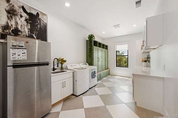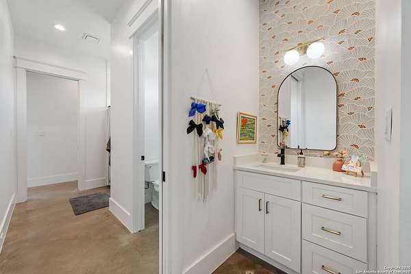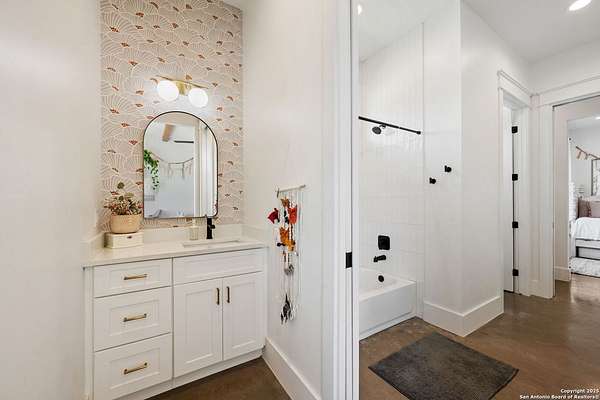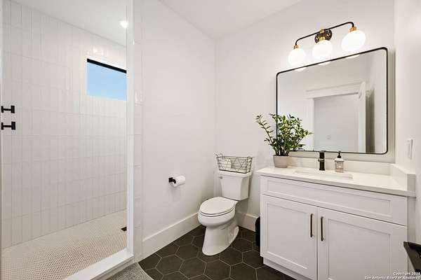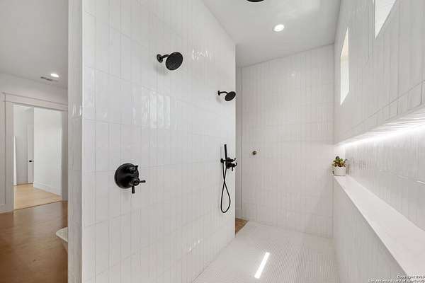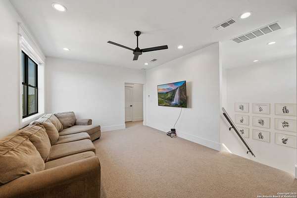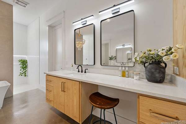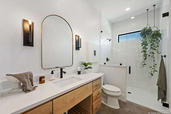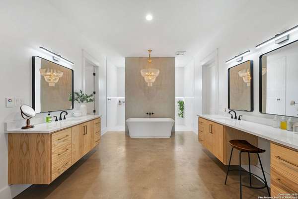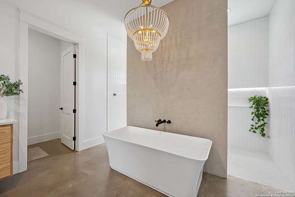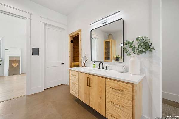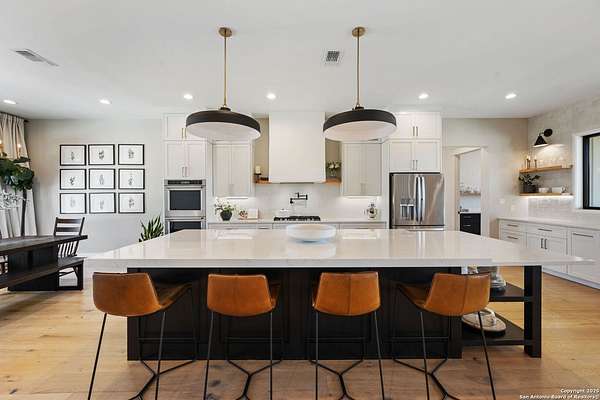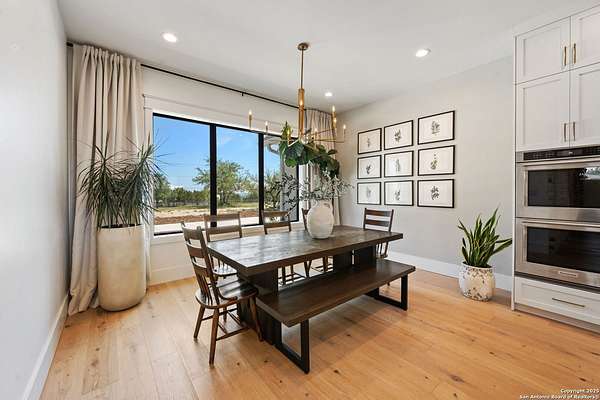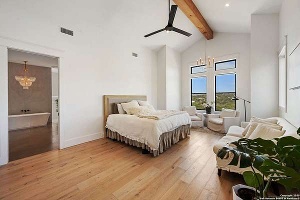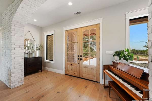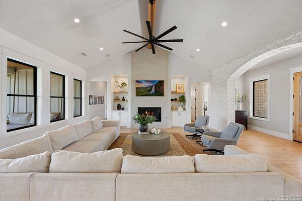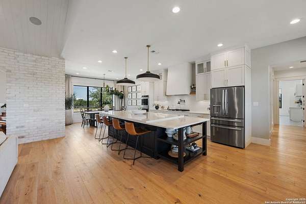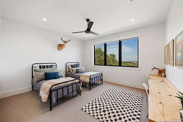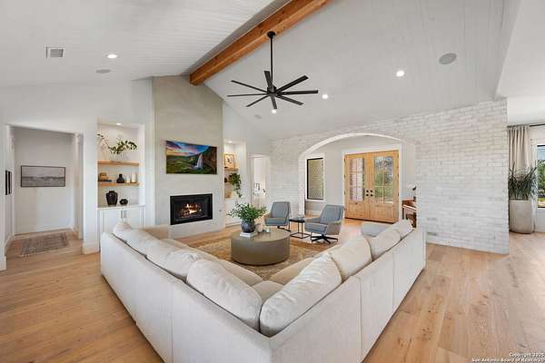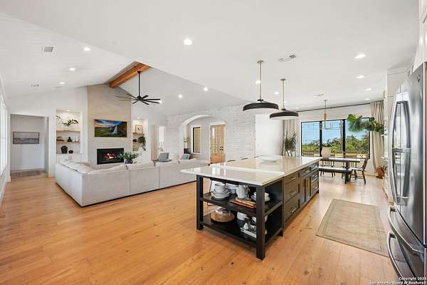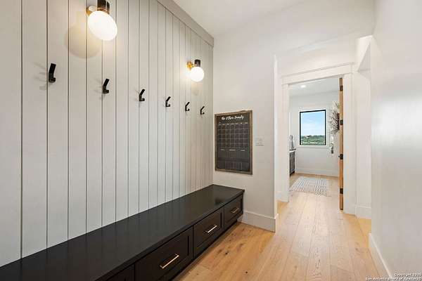Welcome to 837 Mystic Breeze, an exceptional modern farmhouse built in 2023, nestled atop a hillside in the prestigious Mystic Shores community in the TX Hill Country. This 5-bedroom, 4-bathroom custom home offers 4,112 sq ft of beautifully designed living space on a serene 5.14-acre lot, blending luxury, comfort, and sweeping Hill Country views. The property welcomes you with a gated entrance, oak trees, and sustainable rock landscaping. Inside, tall ceilings with exposed wood beams, expansive windows, and wide-plank wood flooring create a warm and open atmosphere filled with natural light. The heart of the home is the spacious living and dining area anchored by a wood-burning fireplace with gas start. Perfect for entertaining, the open-concept layout flows seamlessly into a gourmet kitchen featuring quartz countertops, an oversized island, propane gas cooktop, electric double ovens, pot filler, farmhouse sink, microwave, dishwasher, and custom cabinetry. A generous butler's pantry adds functionality with custom cabinets, shelving, and a built-in coffee and tea bar. Designer lighting and ceiling fans throughout the home add a polished, cohesive feel. The primary suite is a peaceful retreat with a sitting area, high ceilings, and large windows framing spectacular views. The luxurious en-suite bath offers dual vanities, two walk-in closets, and a spa-style walk-through tiled shower with dual shower heads. A rare highlight is the glass-enclosed dry sauna-ideal for relaxation and wellness. Thoughtfully designed for convenience, the home also features a large laundry room with lots of space for a washer, dryer, refrigerator or freezer, plus a utility sink and custom cabinetry. A mudroom off the garage entrance includes built-in storage with coat hooks and drawers. Outdoor living shines here, with a spacious covered patio perfect for both lounging and dining. The upper backyard includes turf grass, outdoor string lighting, and hot tub, offering an inviting space to unwind while enjoying stunning views. Tiered flower beds and stone stairs lead to the lower yard with fire pit, enhancing the natural beauty of the landscape. Located in Mystic Shores-one of the Hill Country's premier communities-residents enjoy world-class amenities including two swimming pools, pickleball, tennis, basketball, and volleyball courts, a community center, two lakeside parks with grilling and picnic areas, and a 200+ acre nature preserve. 837 Mystic Breeze is more than just a home-it's a lifestyle, offering privacy, elegance, and an unparalleled Hill Country setting just minutes from Canyon Lake. Don't miss the opportunity to make this one-of-a-kind retreat your own.